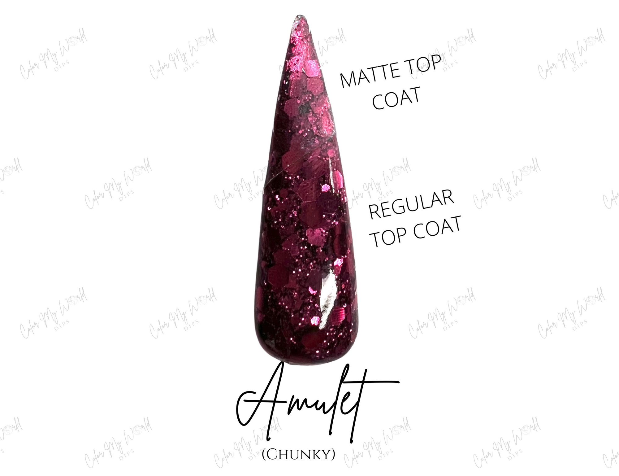 Our dip powders are sold in 1/4 oz, 1/2 oz or full size 1 oz jars and are available in a variety colors and glitters. All of our powders are MMA free, non-yellowing and made with high quality cosmetic grade ingredients. All swatches are dipped 3 times and then followed with a clear dip powder coat. All swatches use our Dipping System liquids. For best results, we recommend following the same process. Our Dip powder nails can last anywhere from 2-4 weeks!