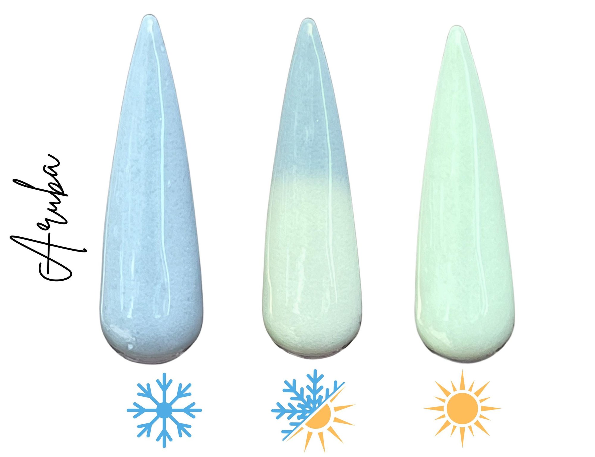This thermal changes from a soft powder blue when cold and transitions to light seafoam green as it gets hotter.