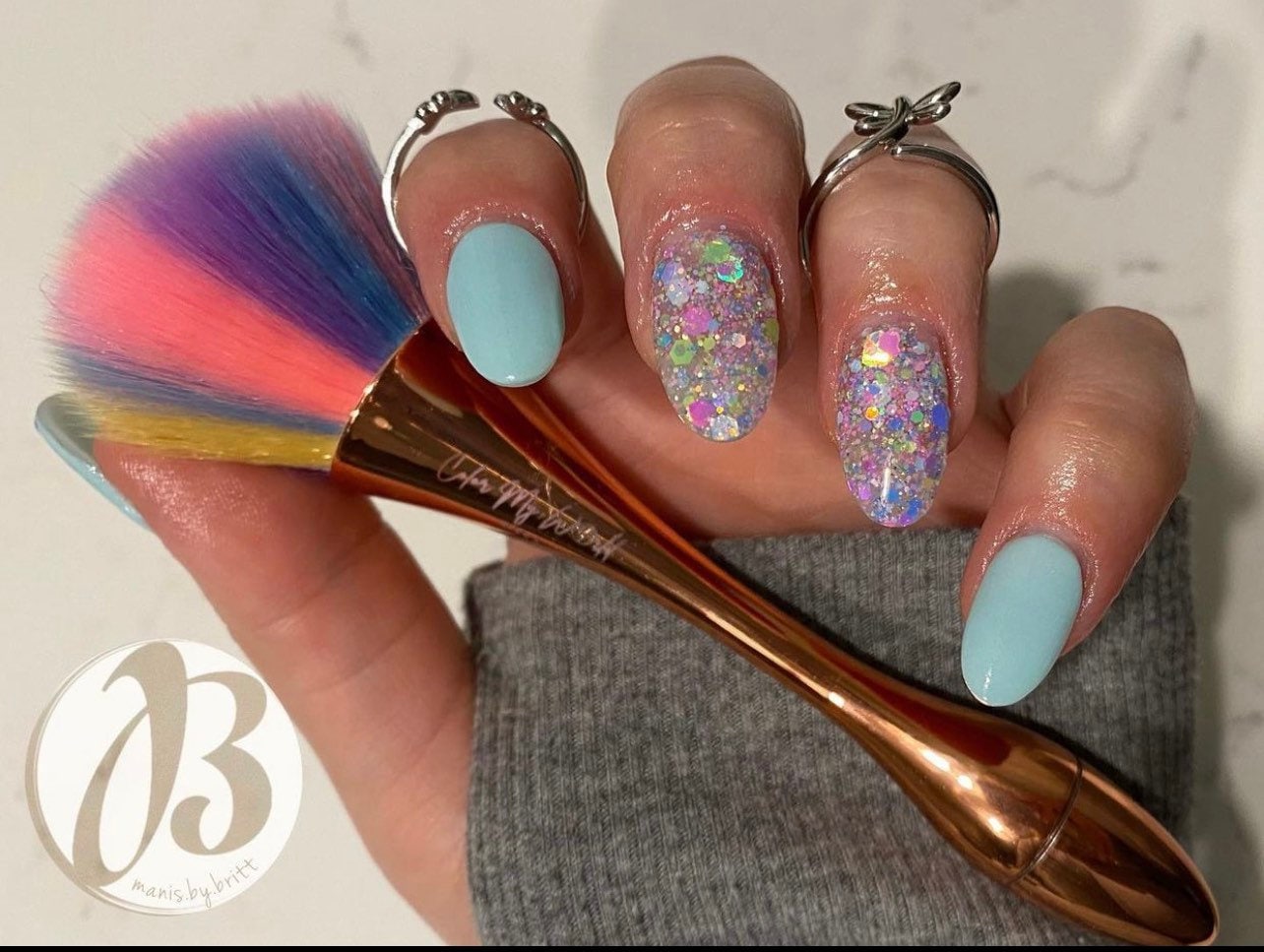 ✨STEP 4: Apply another thin layer of Base Coat to entire nail, avoiding the cuticle. Dip nail at an angle into color powder of choice. Tap nail to help excess powder off. Wait a moment then brush off excess powder with a fluffy brush. Repeat process 2 more times or until desired opacity is achieved.