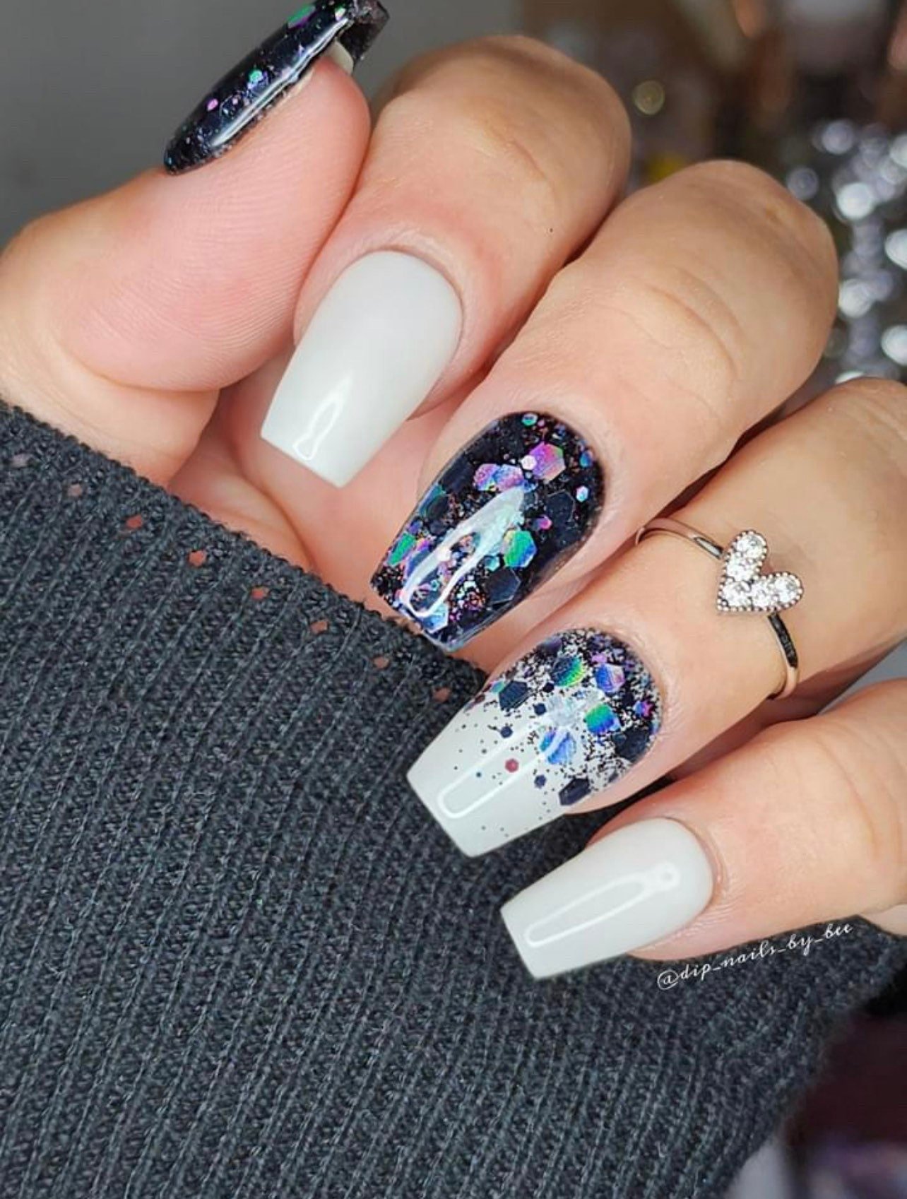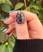 This stunning black dip features holographic chunky black glitter that gives a eerie sparkle. Great for Halloween manis!