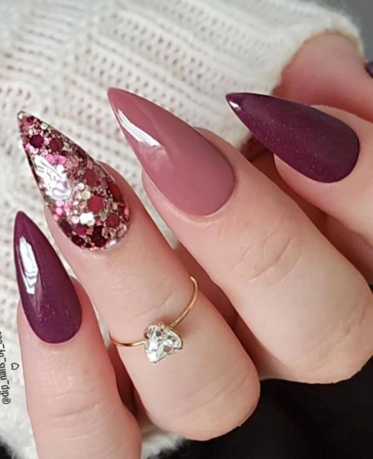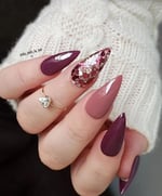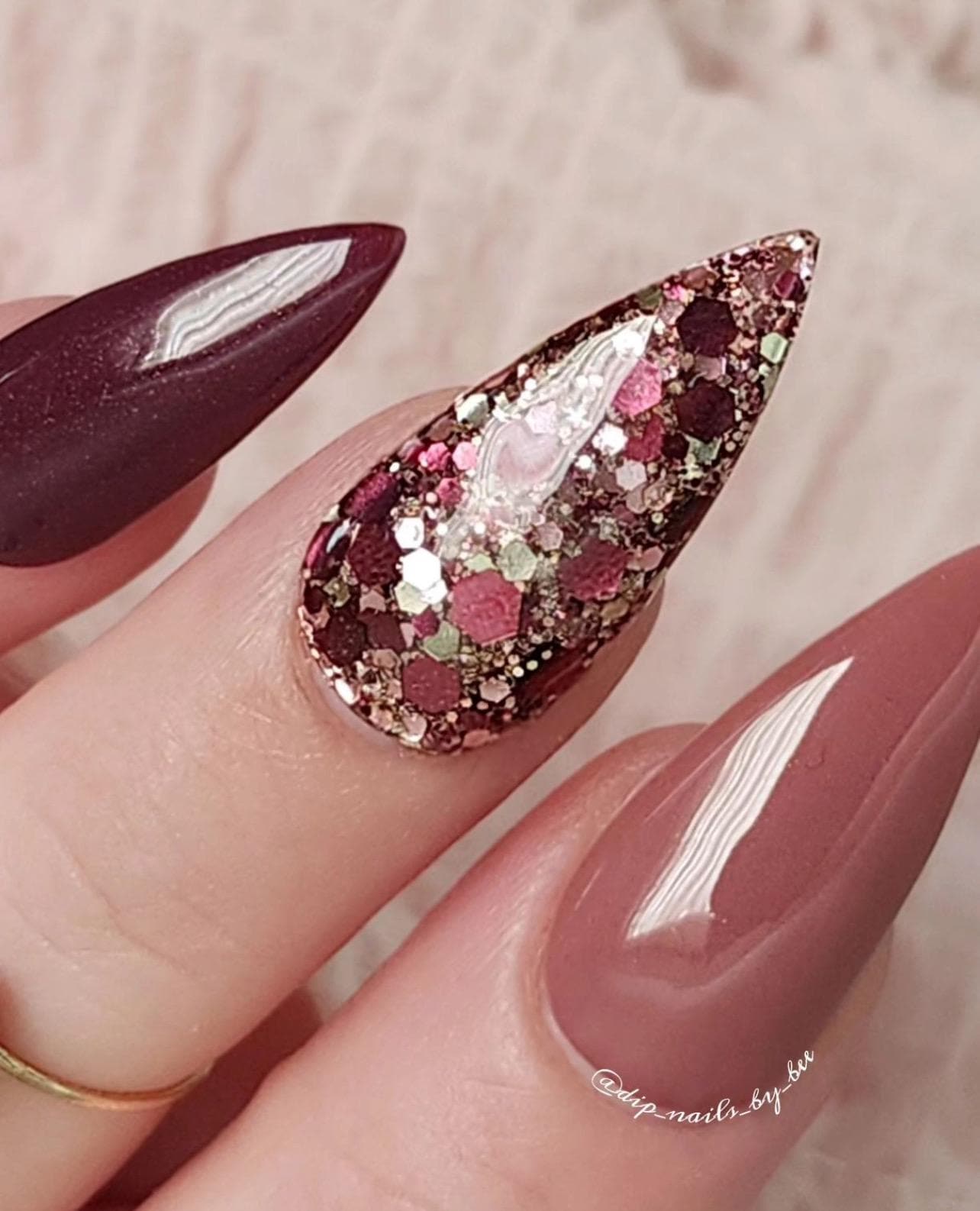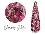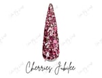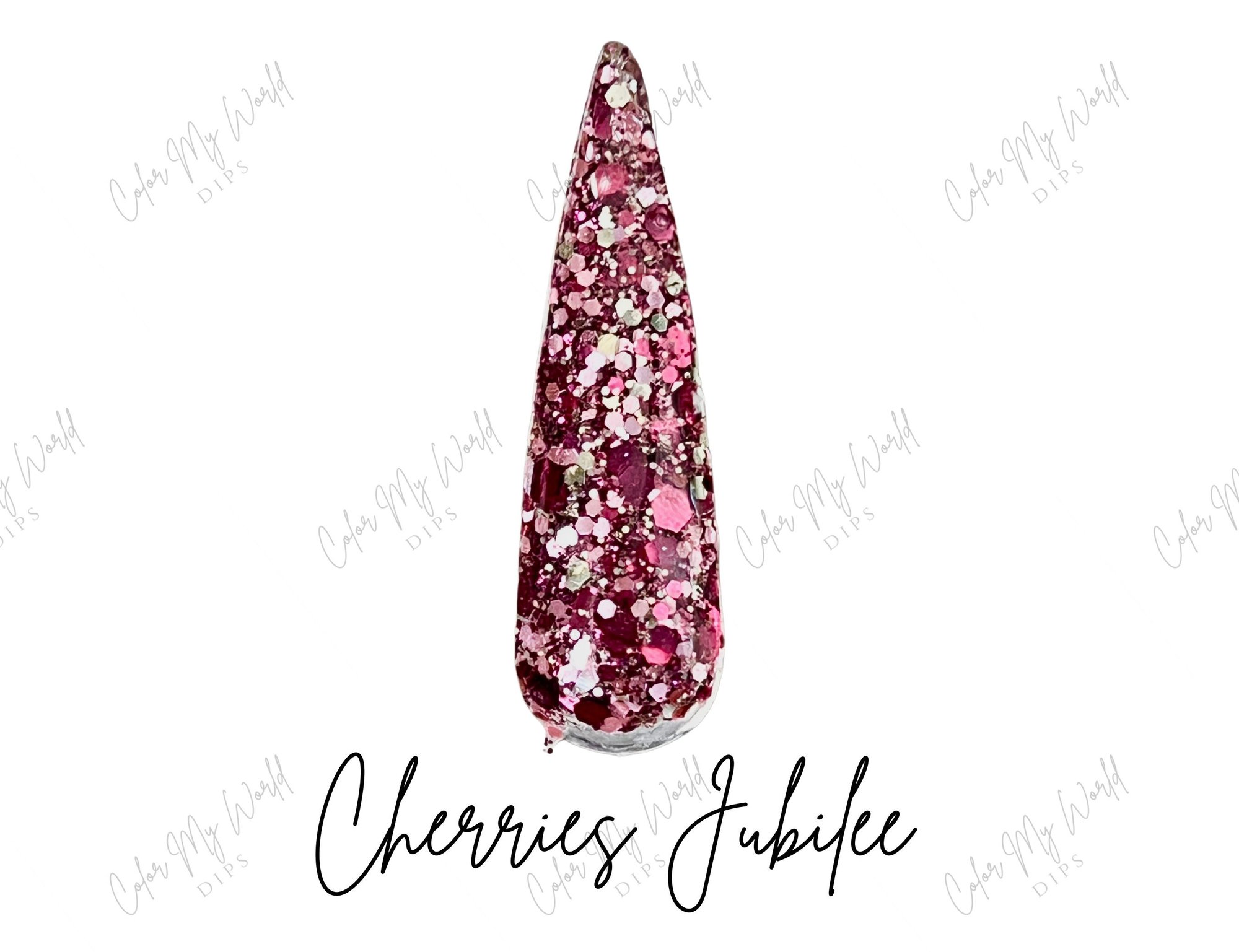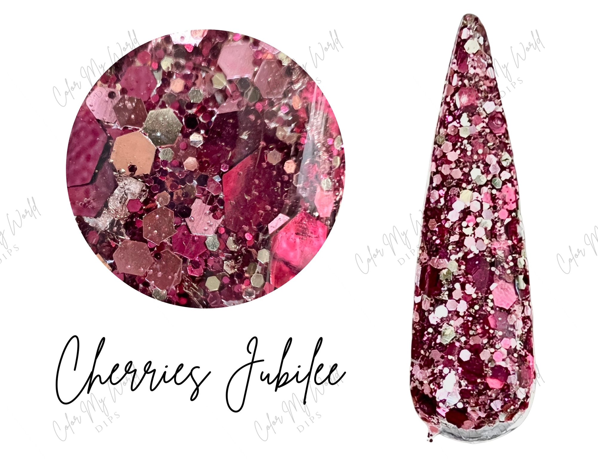 “Cherries Jubilee” is an easy to use medium chunky glitter dip! Featuring burgundy, gold, rose gold and fine brown foils.