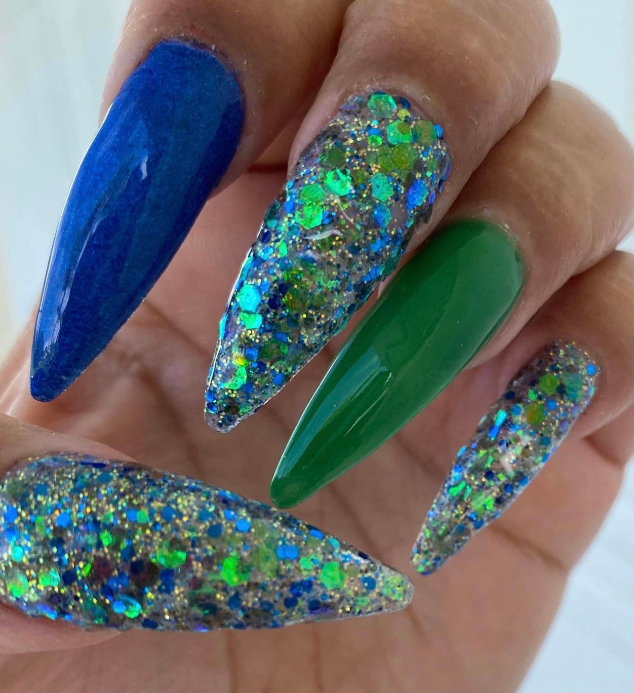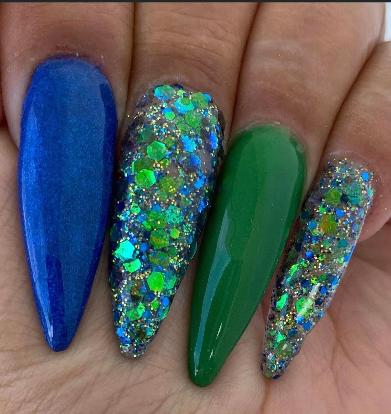 Our dip powders are sold in 1/4 oz, 1/2 oz or full size 1 oz jars and are available in a variety colors and glitters. All of our powders are MMA free, non-yellowing and made with high quality cosmetic grade ingredients. All swatches are dipped 3 times and then followed with a clear dip powder coat. All swatches use our Dipping System liquids. For best results, we recommend following the same process. Our Dip powder nails can last anywhere from 2-4 weeks!