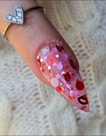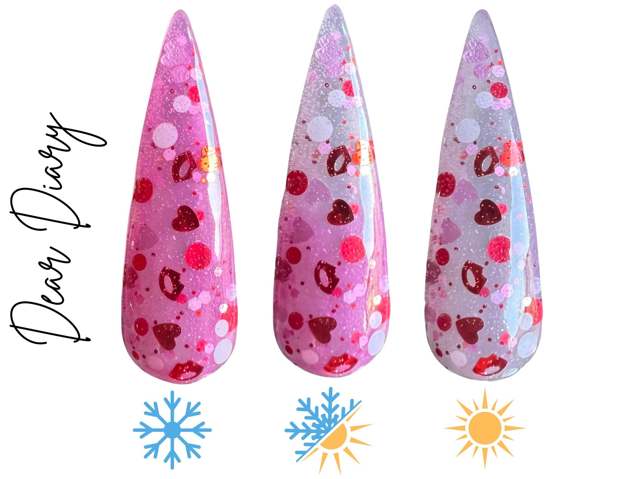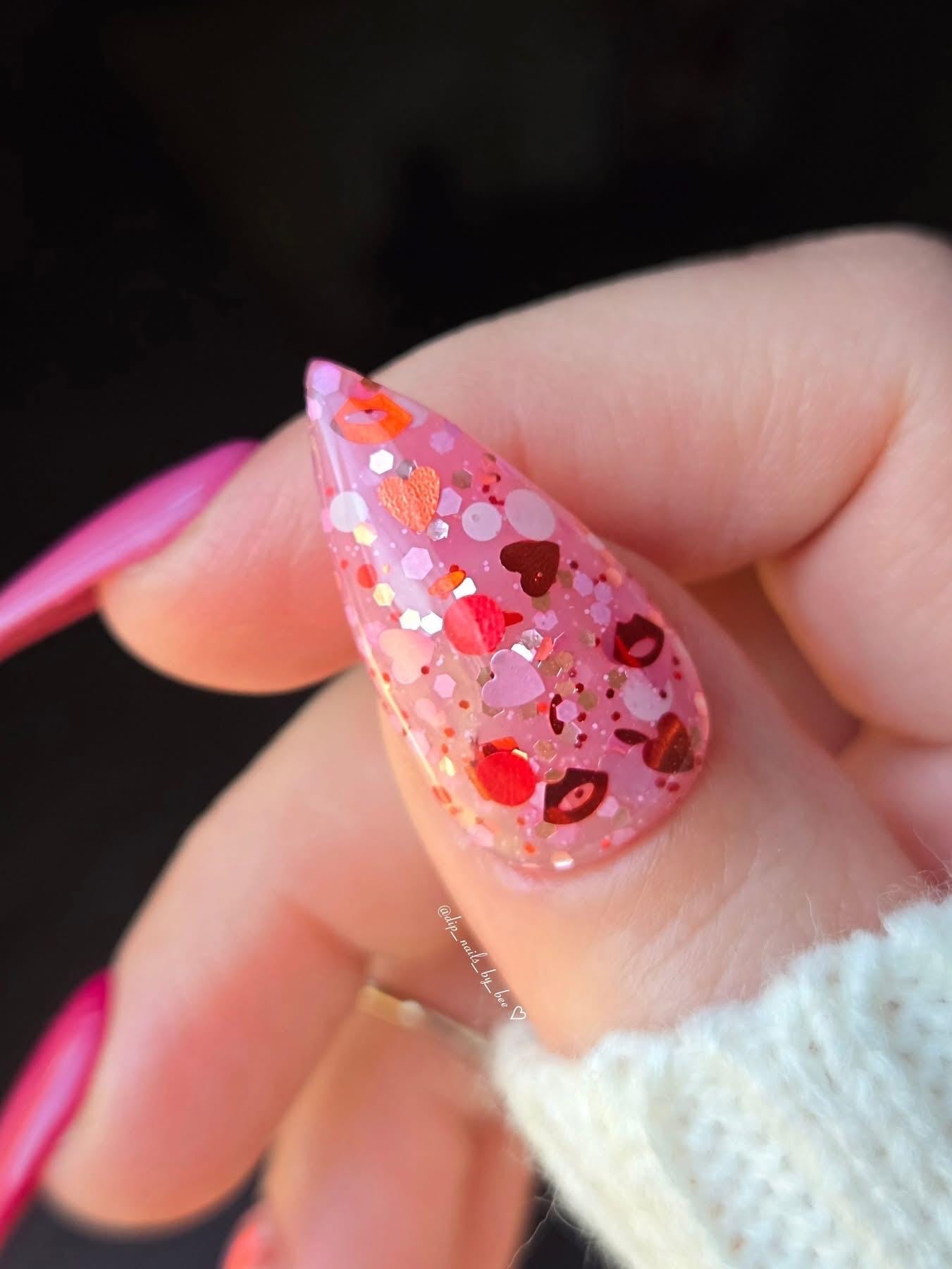 The CUTEST valentines dip ever!? This pink thermal dip powder features red and pink hearts, red lips and chunky glitter. This thermal changes from a hot pink when it’s cold to semi-translucent milky color when it’s hot.