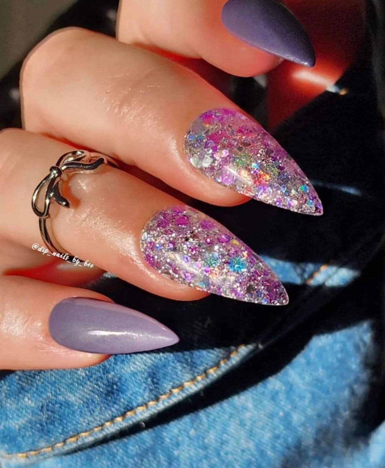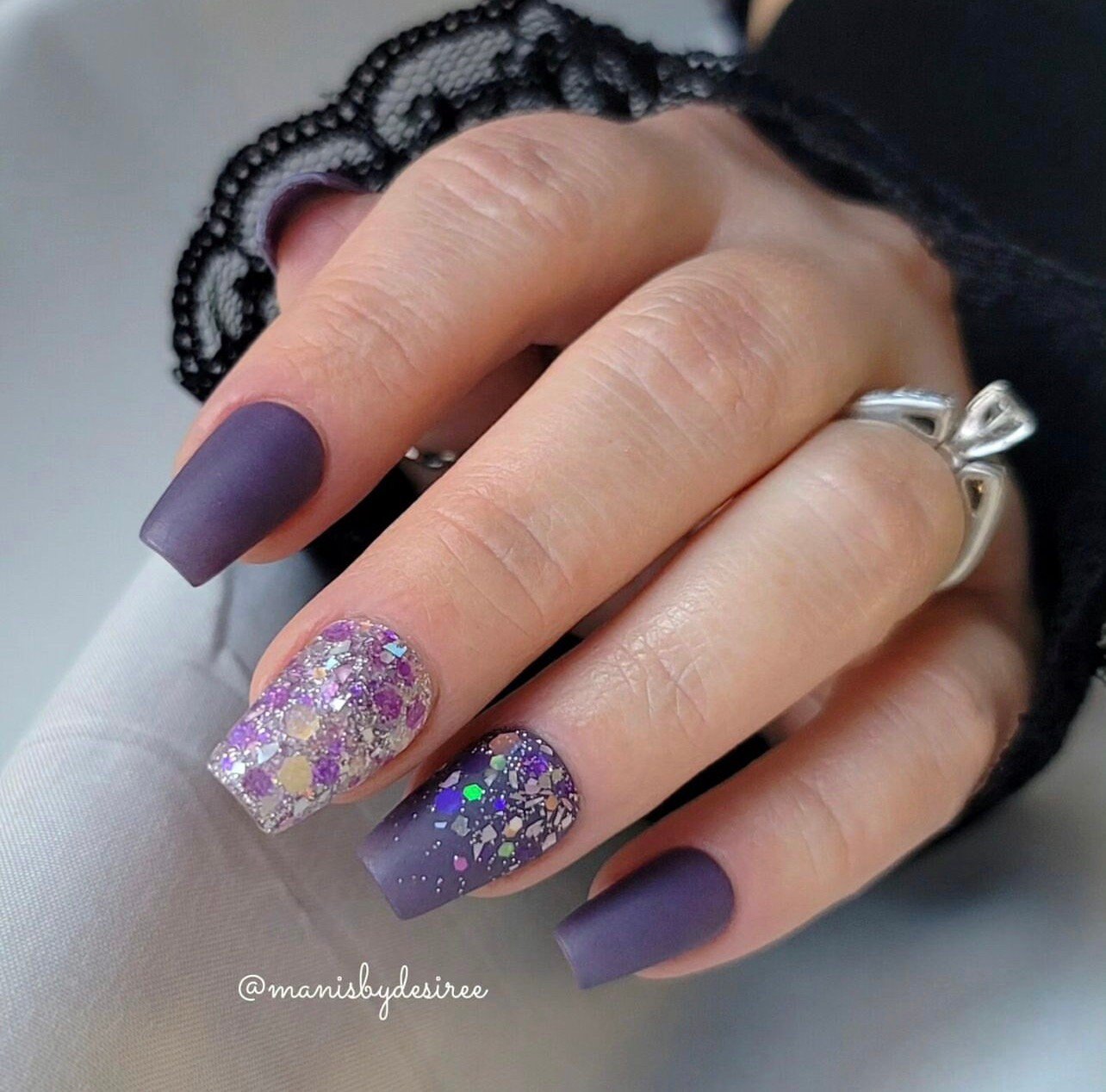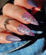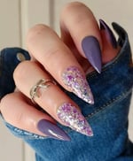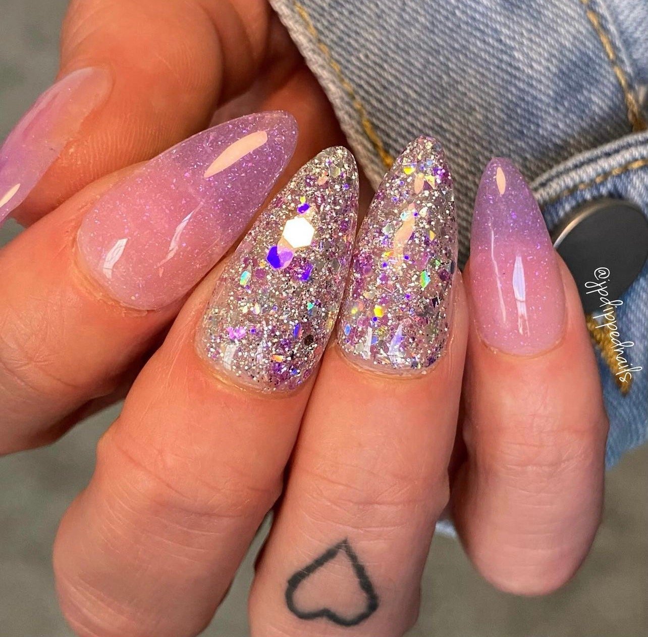 “Enchanted” is a magical dip made with holographic and iridcent silver and purple glitter.