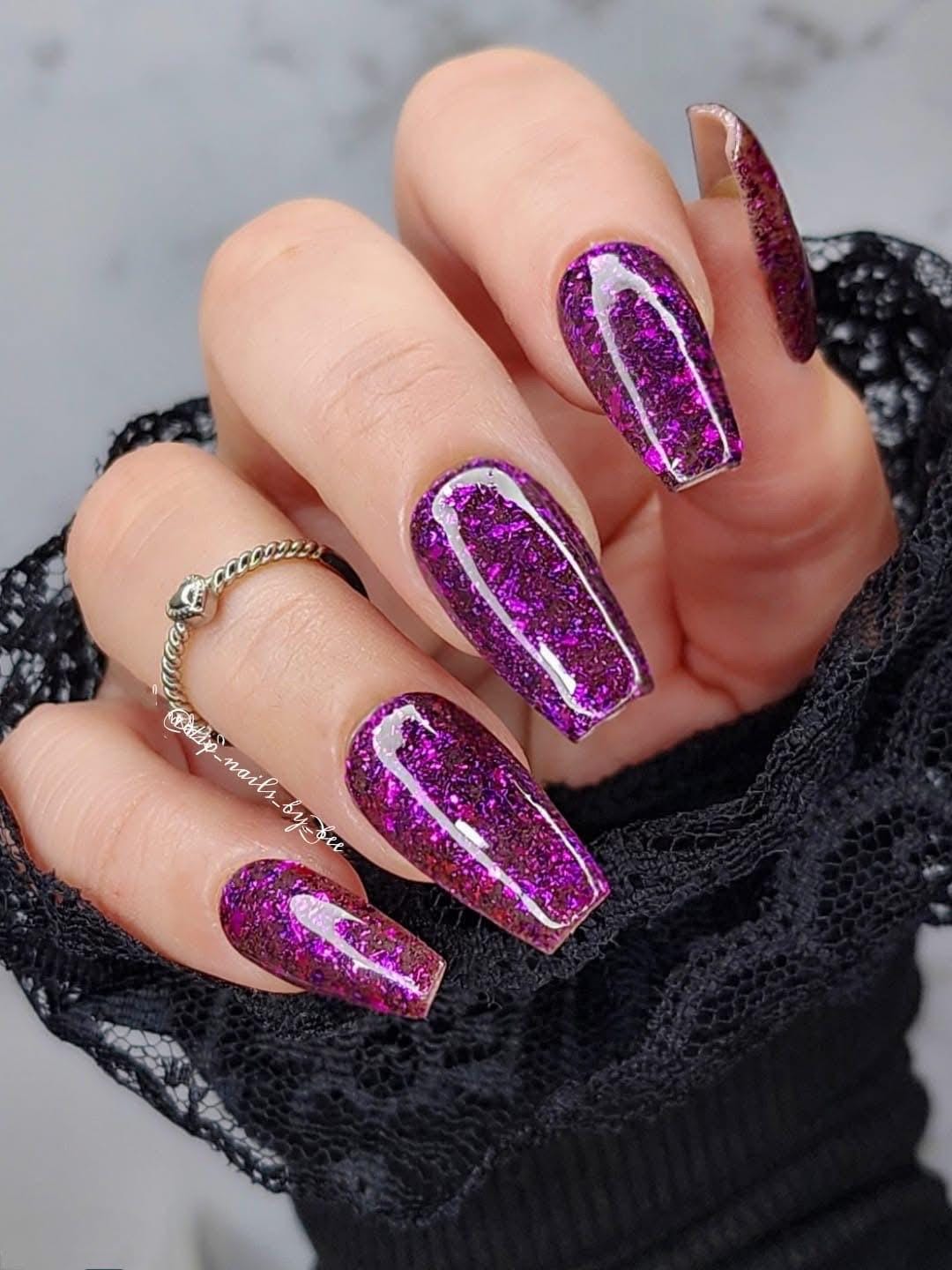 Gorgeous magenta and purple foils set in a sheer black dip powder!