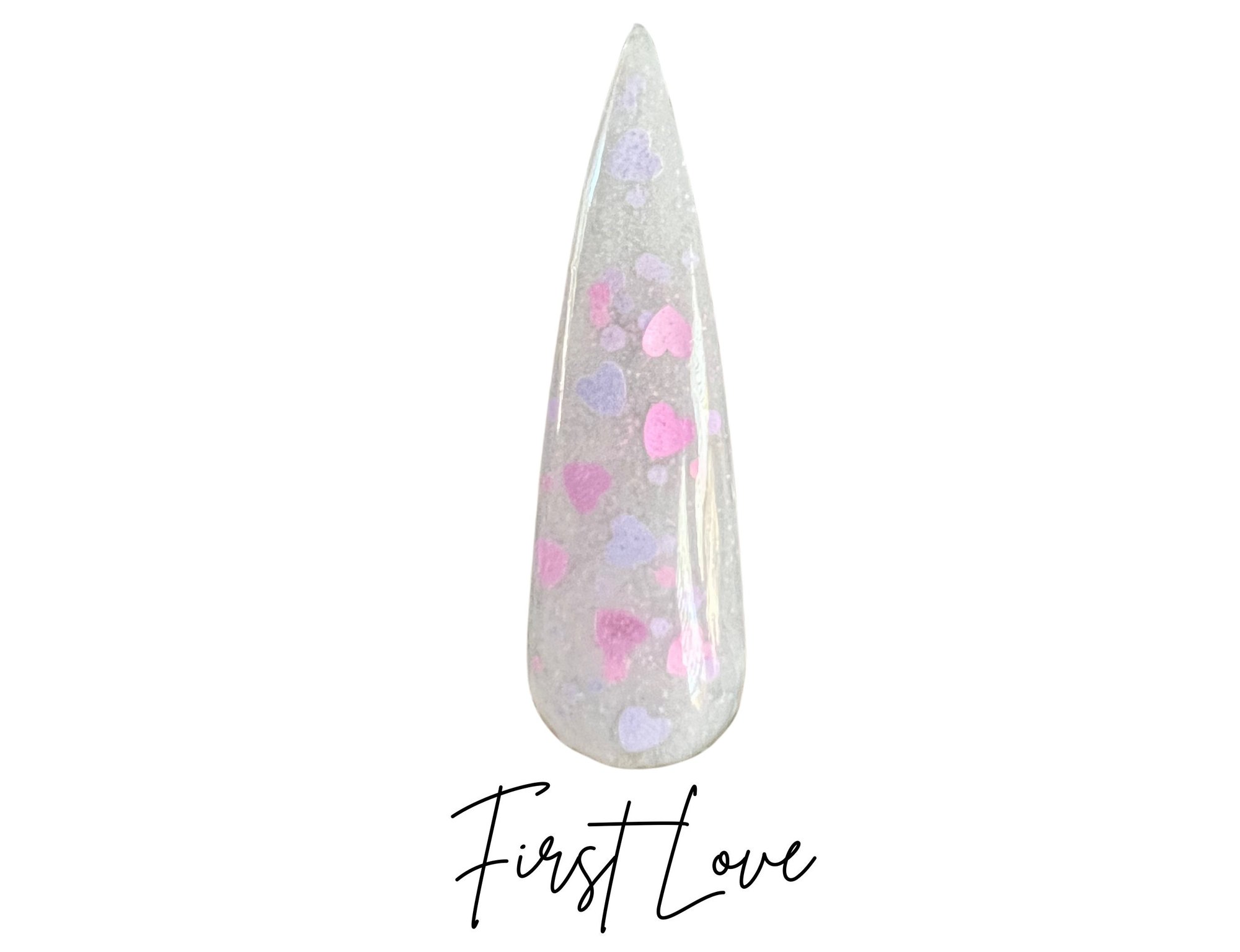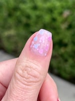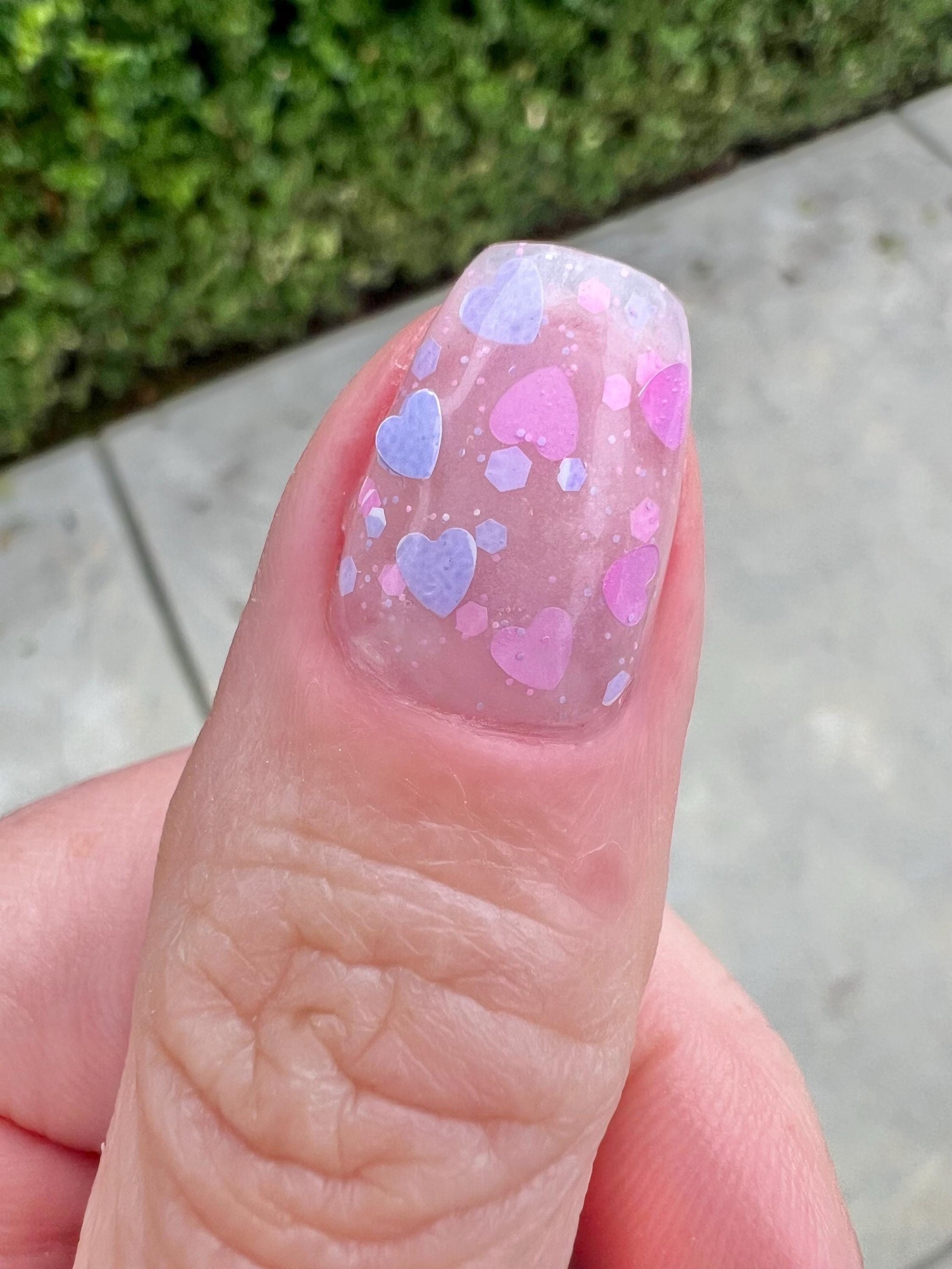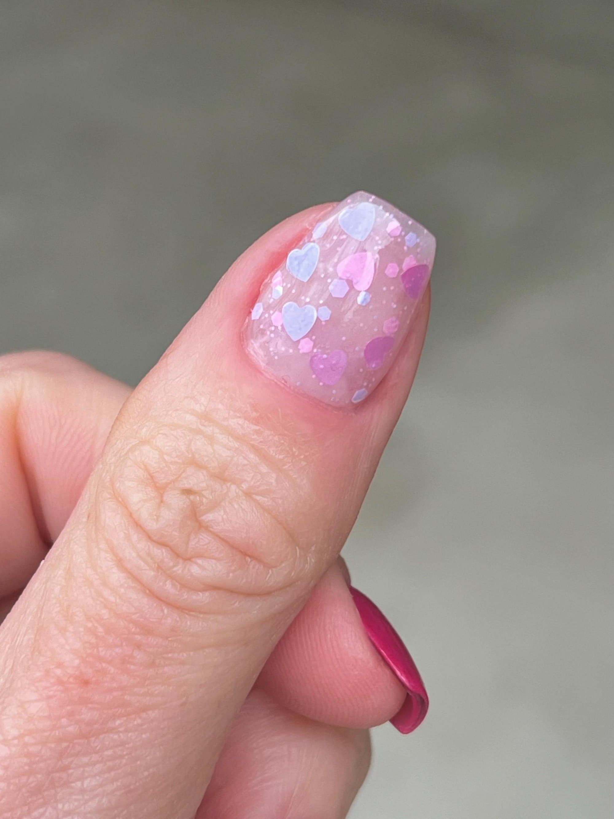 A gorgeous and sweet looking Valentine’s Day dip powder! Featuring pink and lilac glitter and hearts set in a soft milky white dip powder!