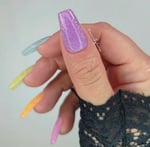 This fine glitter dip is semi-translucent. Not too transparent to show your too much of your natural nails and not too opaque! It’s a Goldilocks of “jelly” dips. It features iridescent glitter that shimmers from purple to pink.