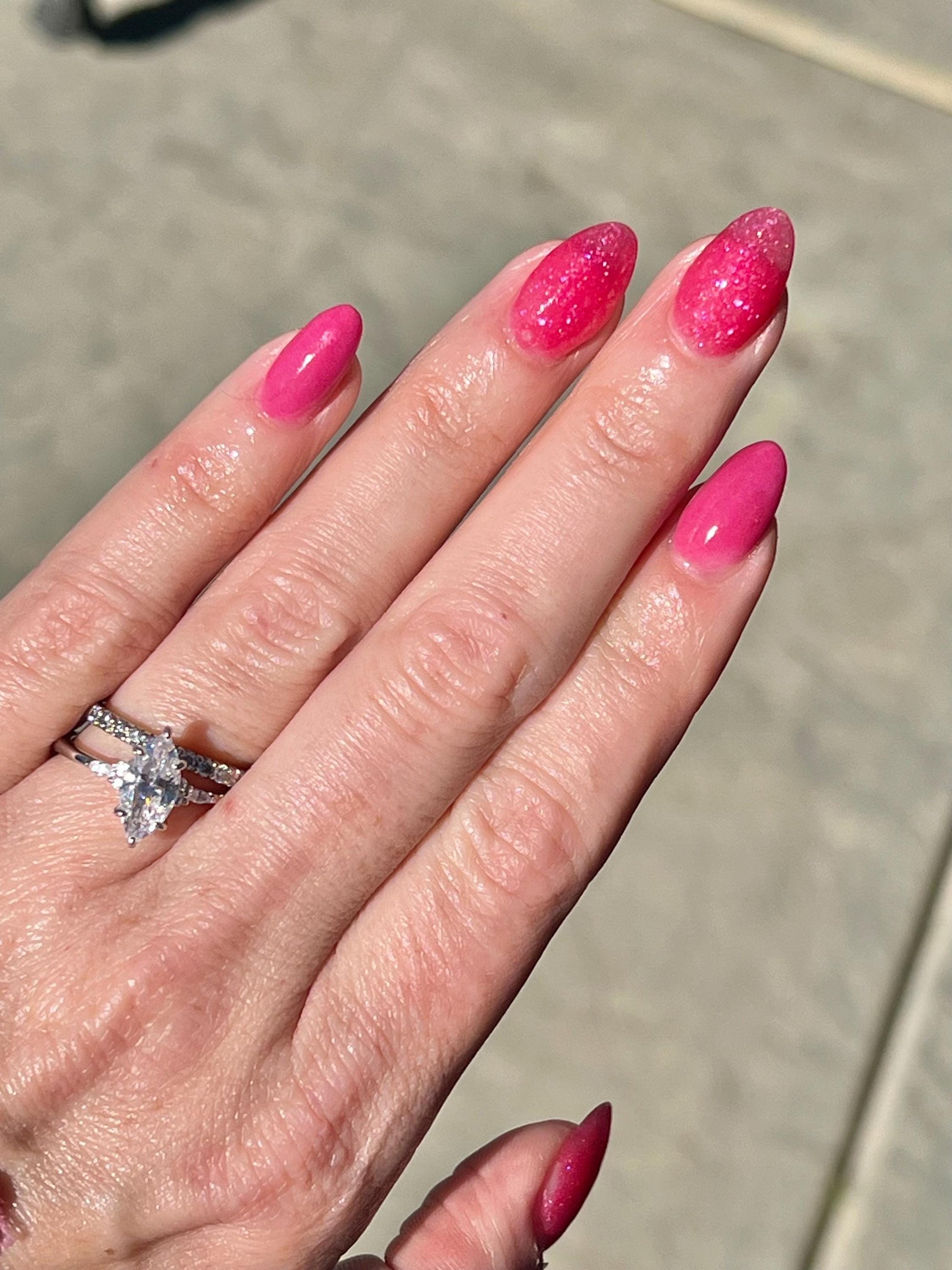 Our dip powders are sold in 1/4 oz, 1/2 oz or full size 1 oz jars and are available in a variety colors and glitters. All of our powders are MMA free, non-yellowing and made with high quality cosmetic grade ingredients. All swatches are dipped 3 times and then followed with a clear dip powder coat. All swatches use our Dipping System liquids. For best results, we recommend following the same process. Our Dip powder nails can last anywhere from 2-4 weeks!