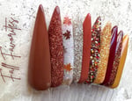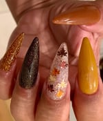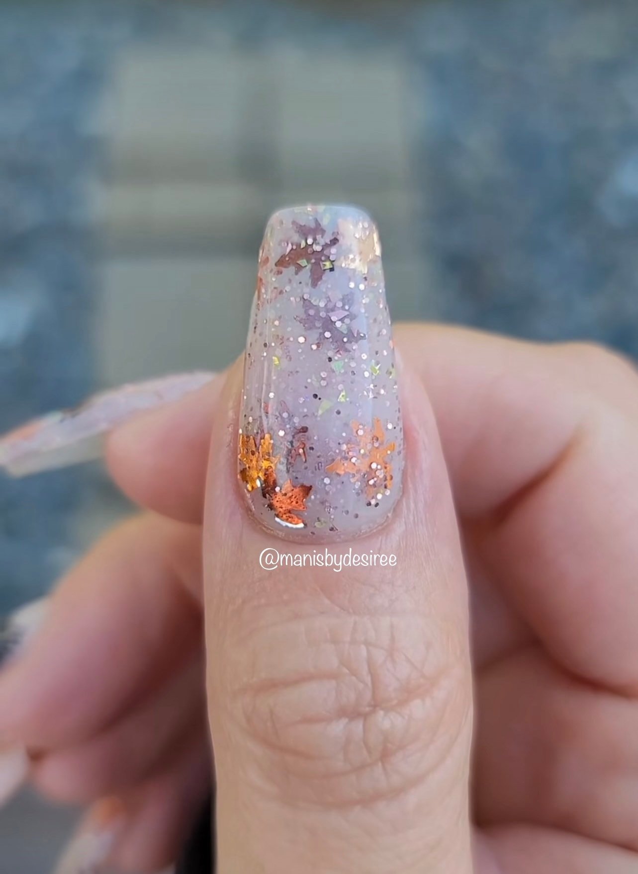 A milky base with brown leaf shapes, fine rose gold, green glitter and shards.