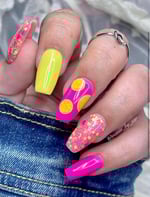 Our dip powders are sold in 1/4 oz, 1/2 oz or full size 1 oz jars and are available in a variety colors and glitters. All of our powders are MMA free, non-yellowing and made with high quality cosmetic grade ingredients. All swatches are dipped 3 times and then followed with a clear dip powder coat. All swatches use our Dipping System liquids. For best results, we recommend following the same process. Our Dip powder nails can last anywhere from 2-4 weeks!