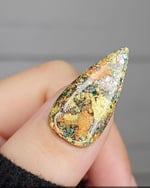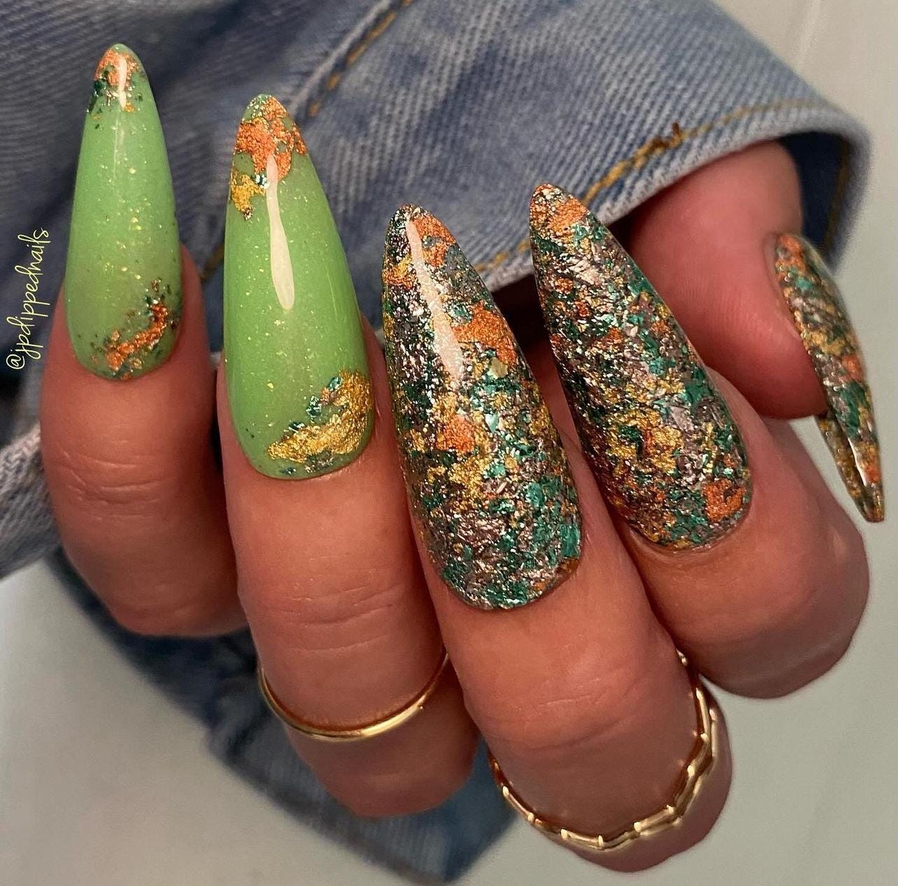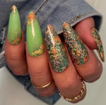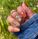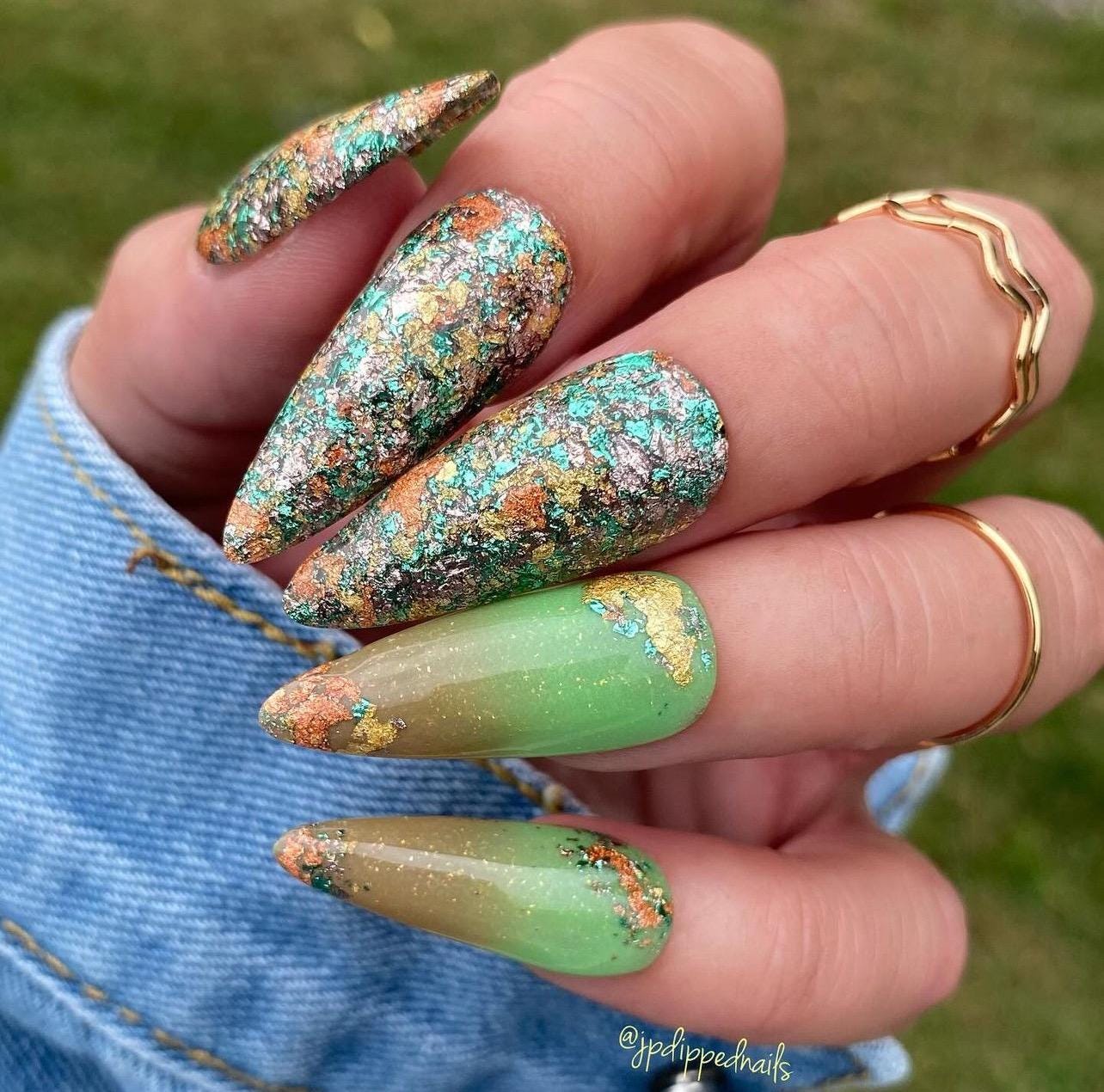 “Leaf Pile” is an all foil dip powder set in a clear base. Featuring gold, rose gold, green and brown foils.