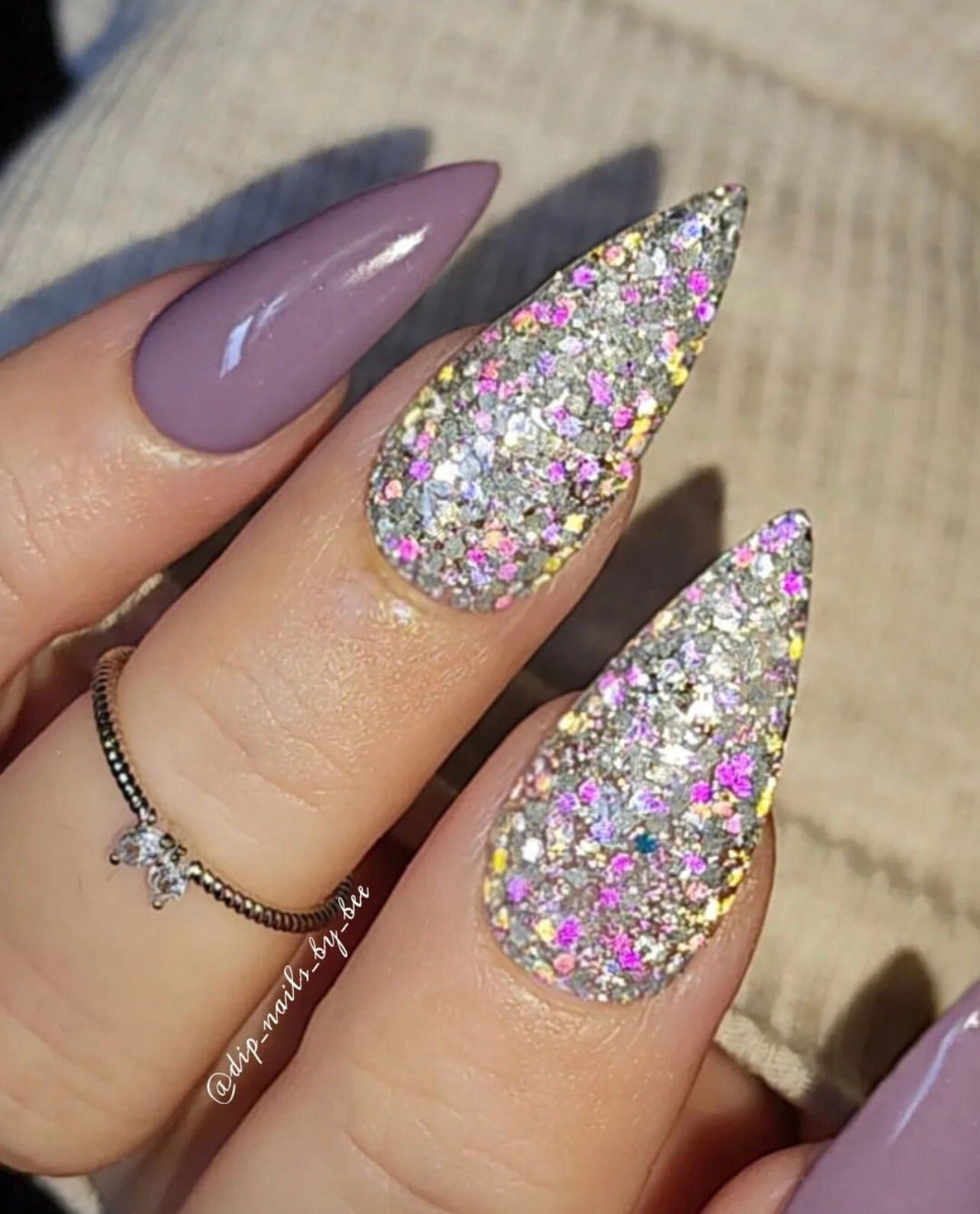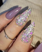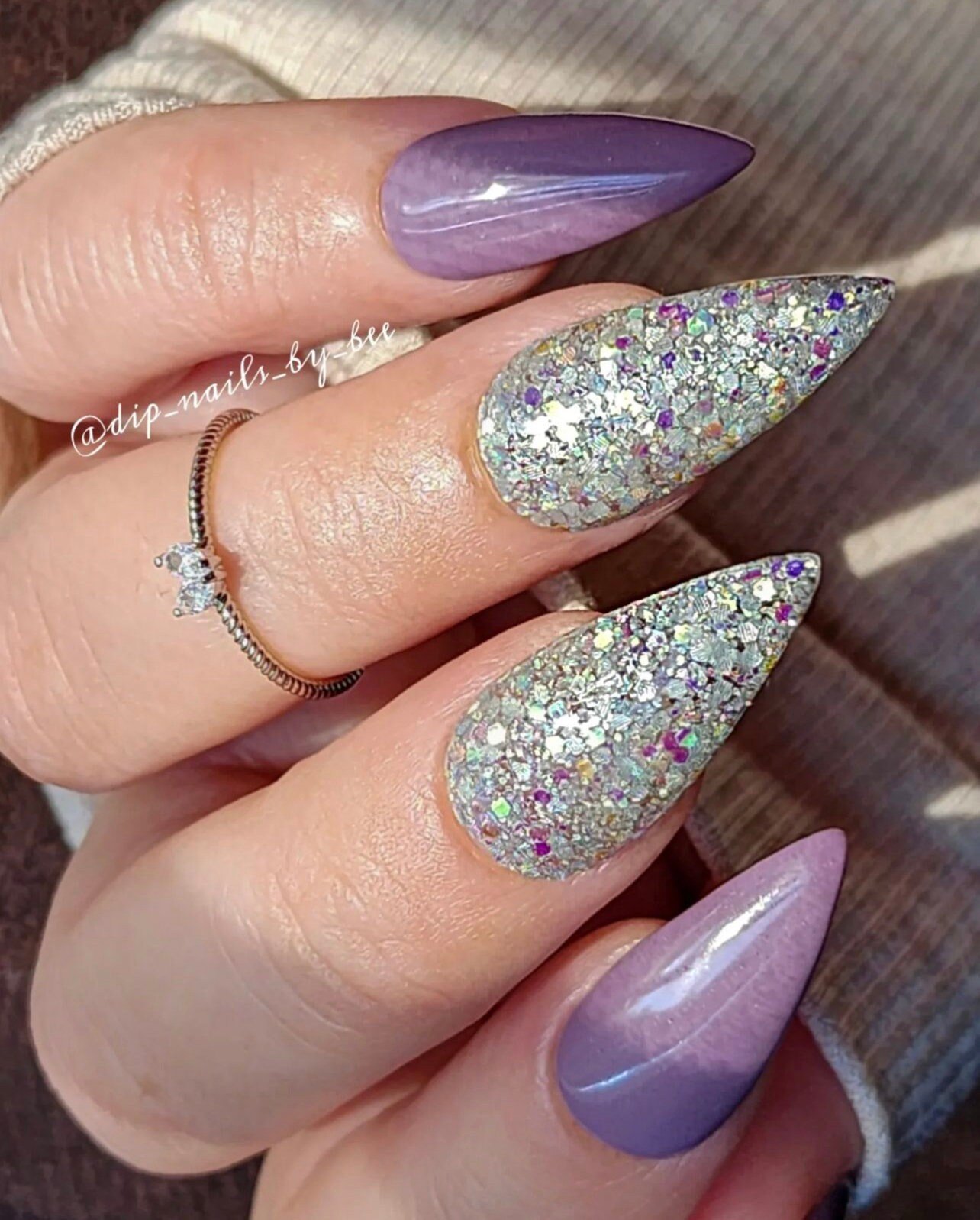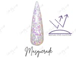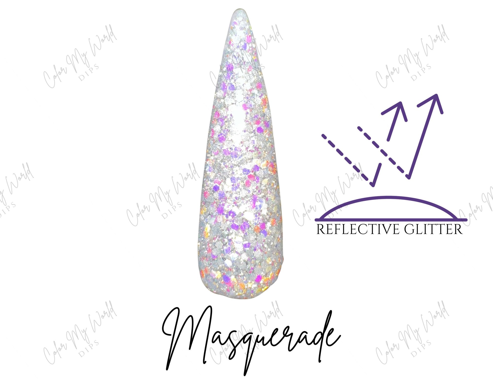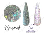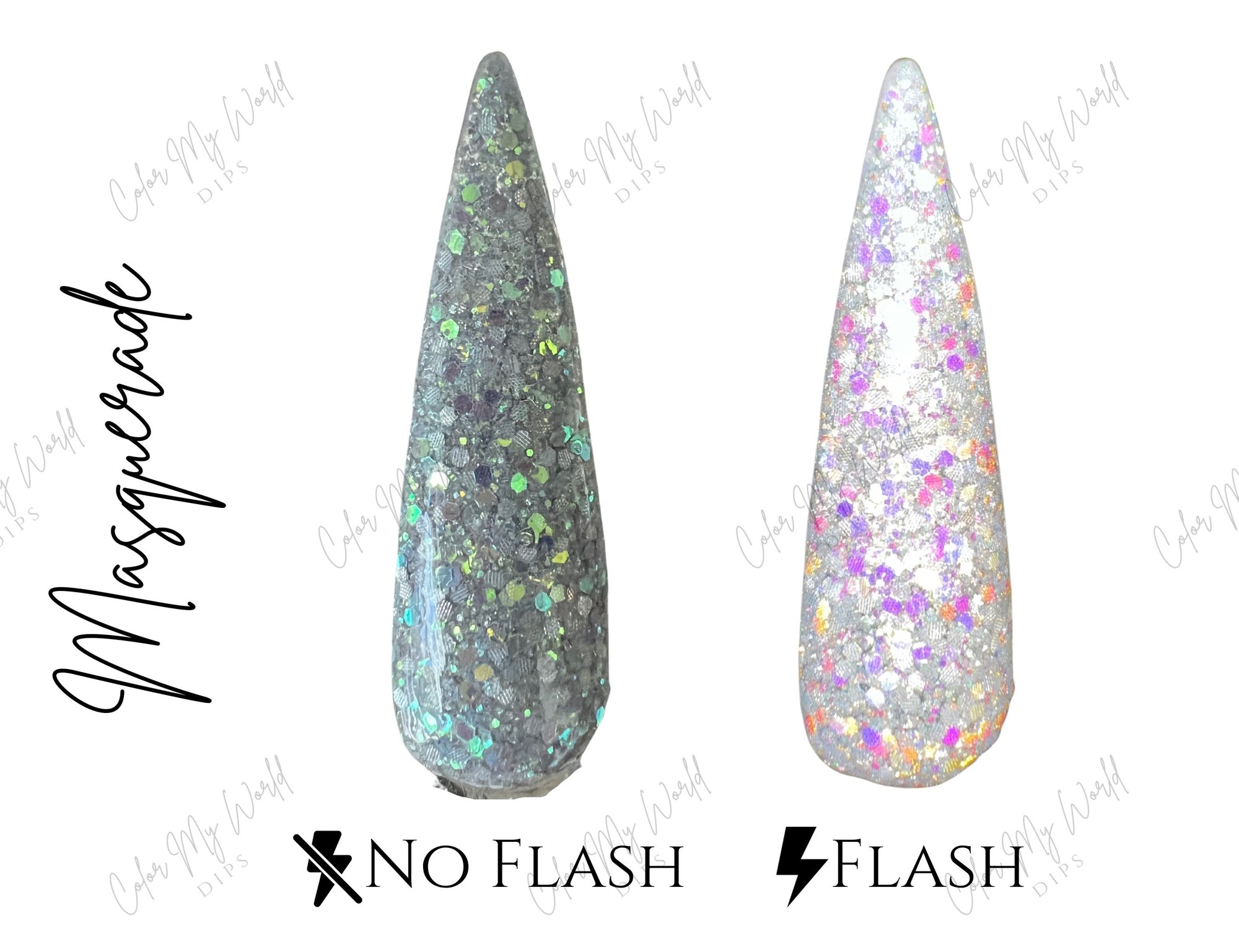 “Masquerade” is gorgeous silver holographic reflective dip! This dip powder comes to life when it’s exposed to flash lighting.