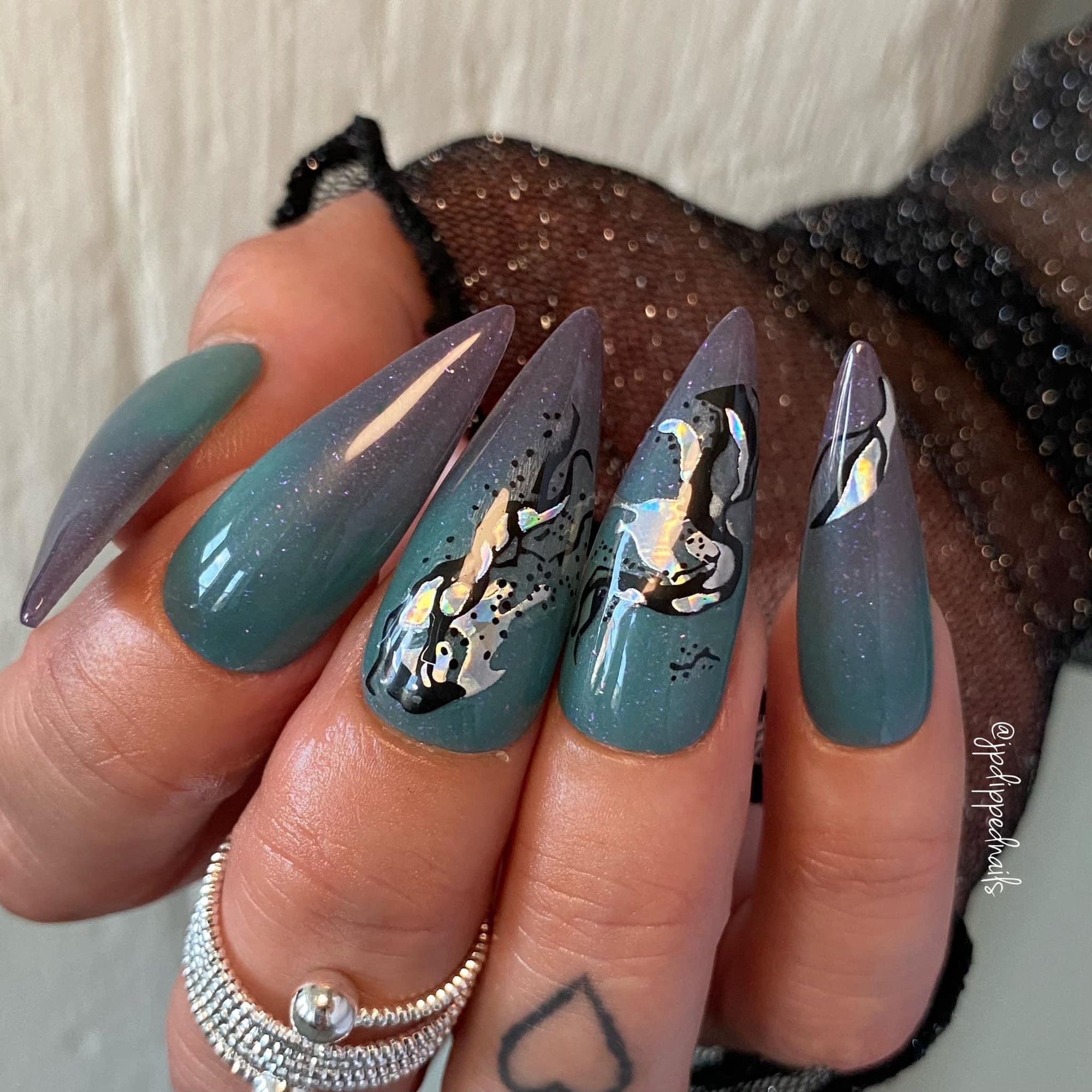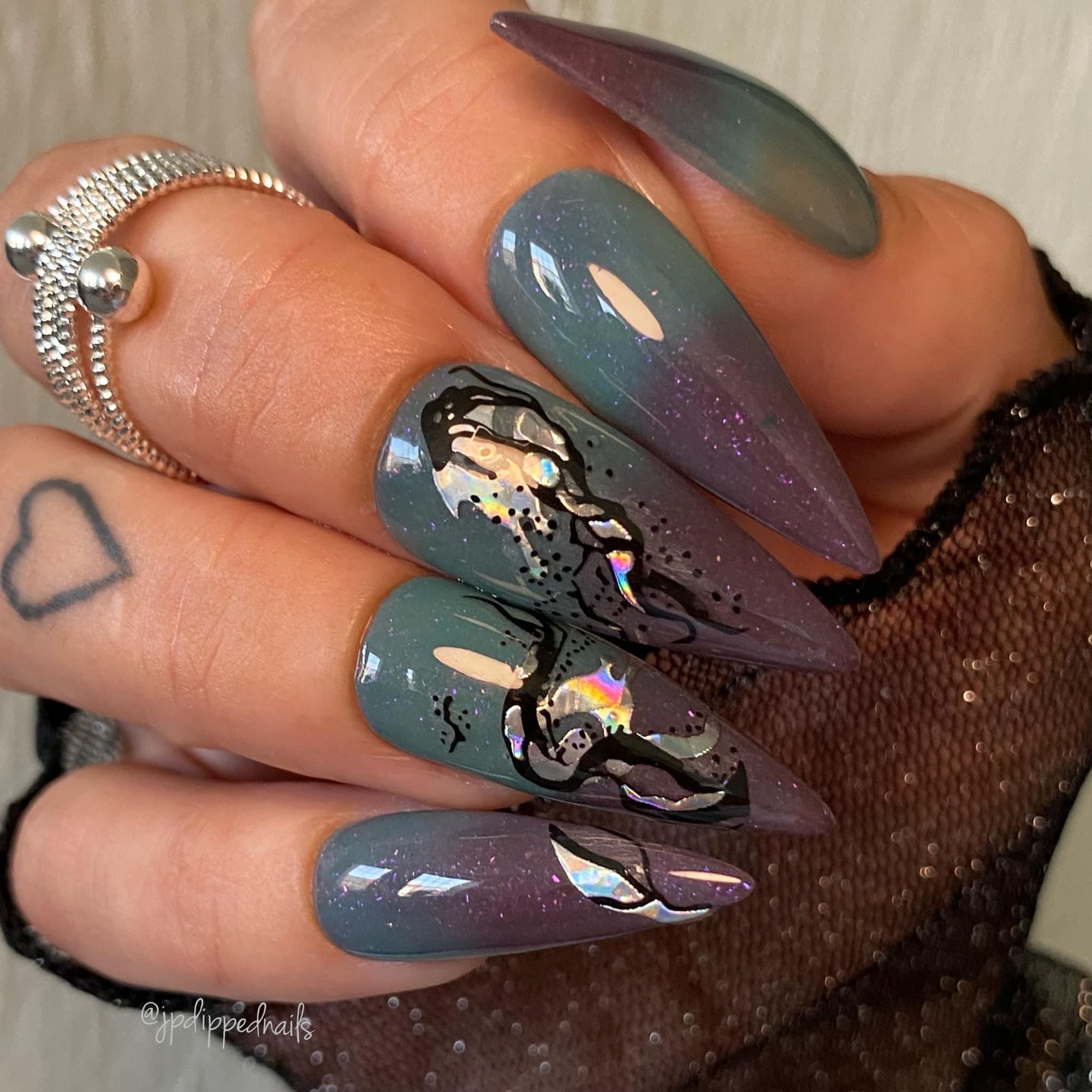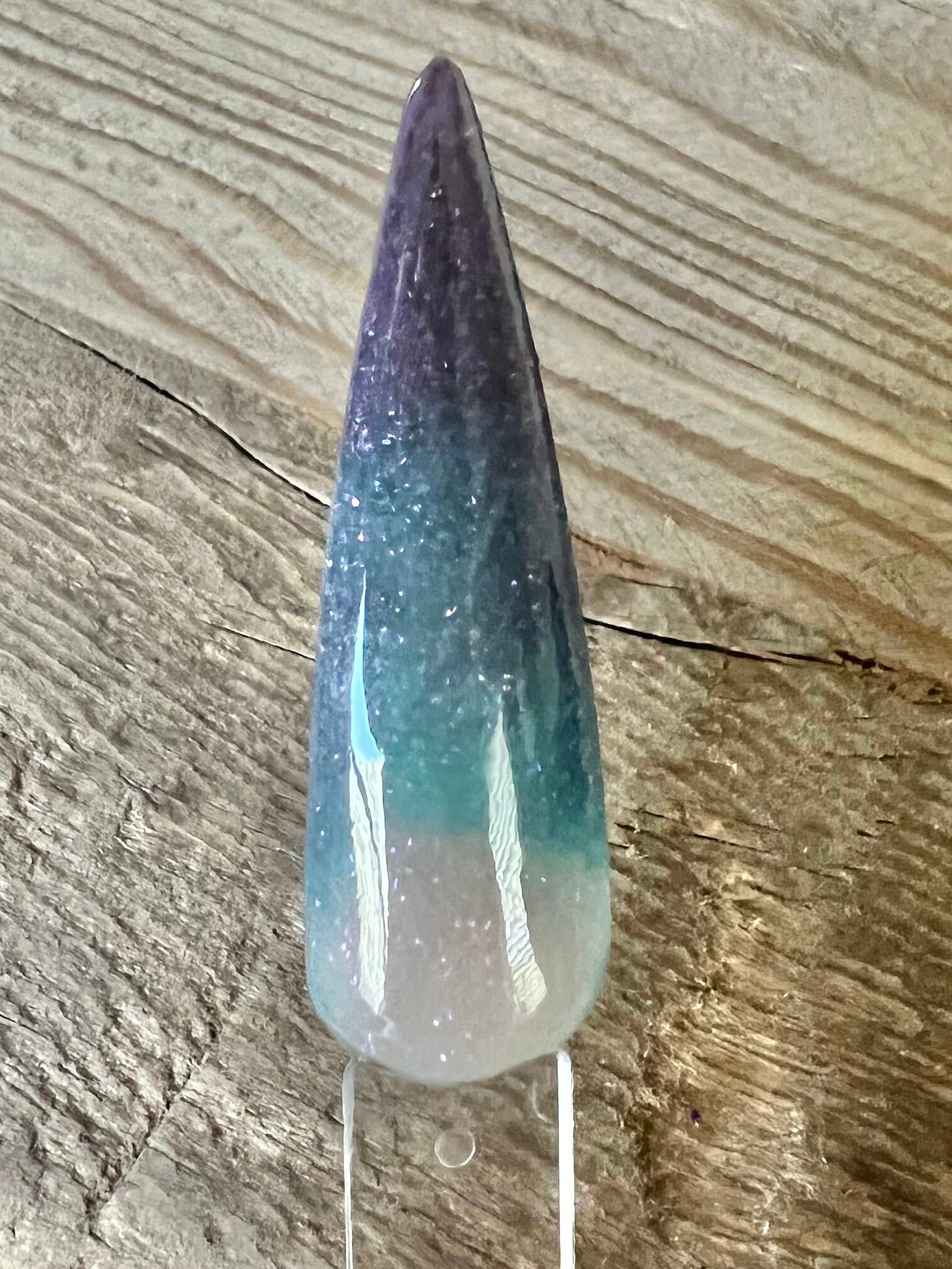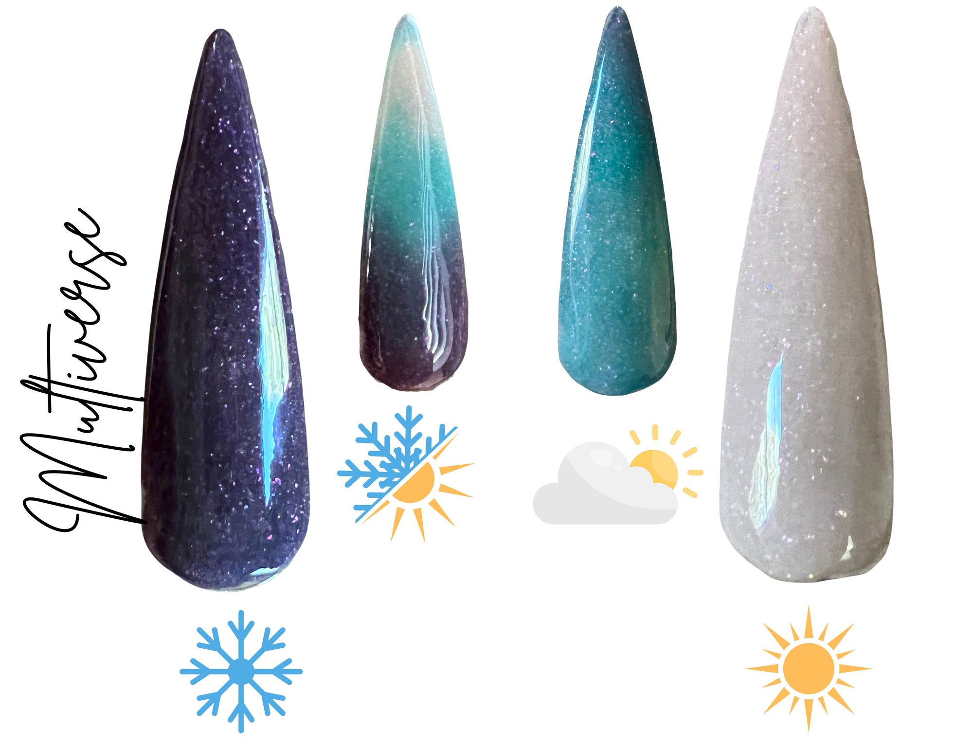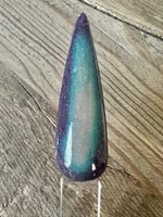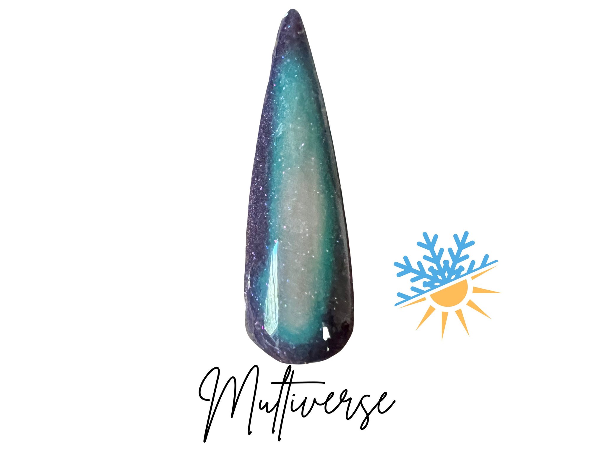 “Multiverse” is a fun triple thermal dip featuring ultra fine flakies. This thermal changes from a dark purple when cold to teal when warm and a taupe when hot.
