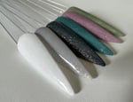 Our dip powders are sold in 1/4 oz, 1/2 oz or full size 1 oz jars and are available in a variety colors and glitters. All of our powders are MMA free, non-yellowing and made with high quality cosmetic grade ingredients. All swatches are dipped 3 times and then followed with a clear dip powder coat. All swatches use our Dipping System liquids. For best results, we recommend following the same process. Our Dip powder nails can last anywhere from 2-4 weeks!