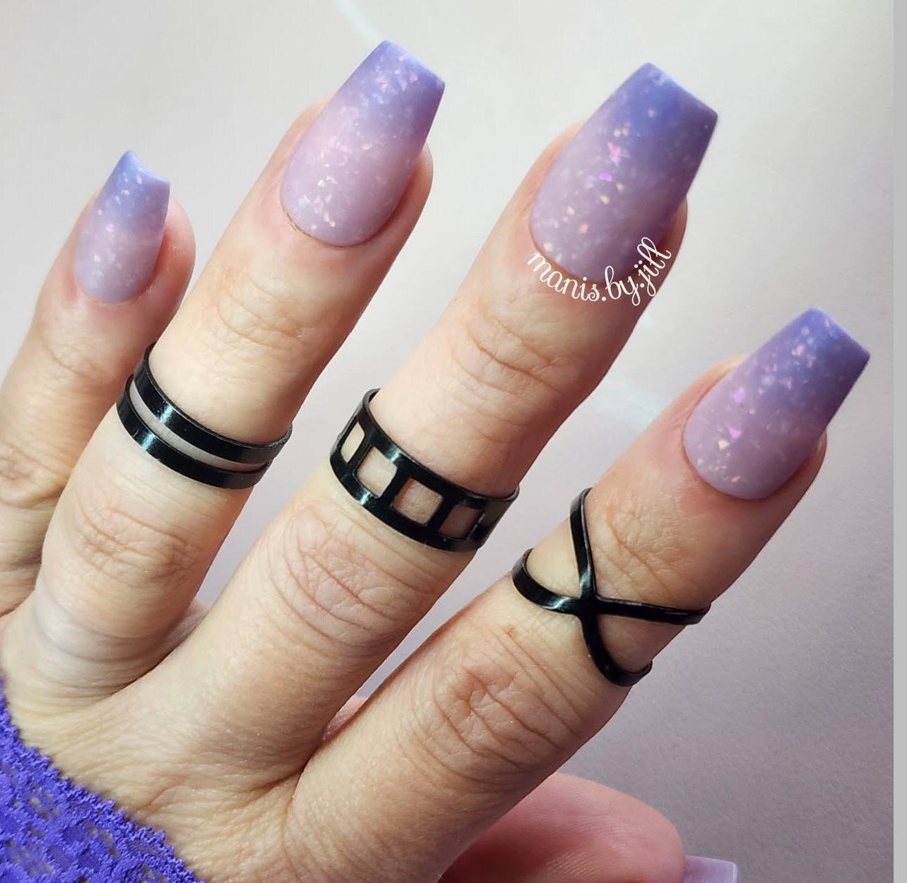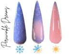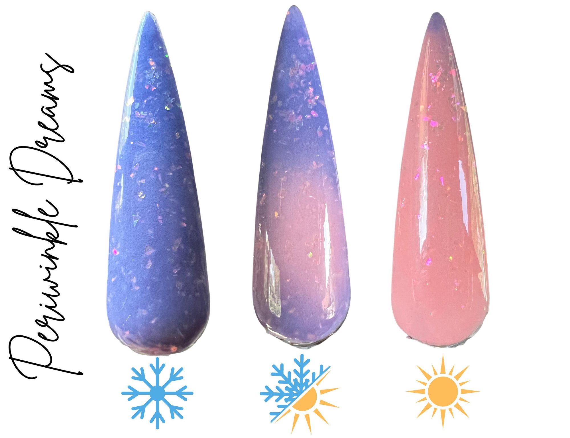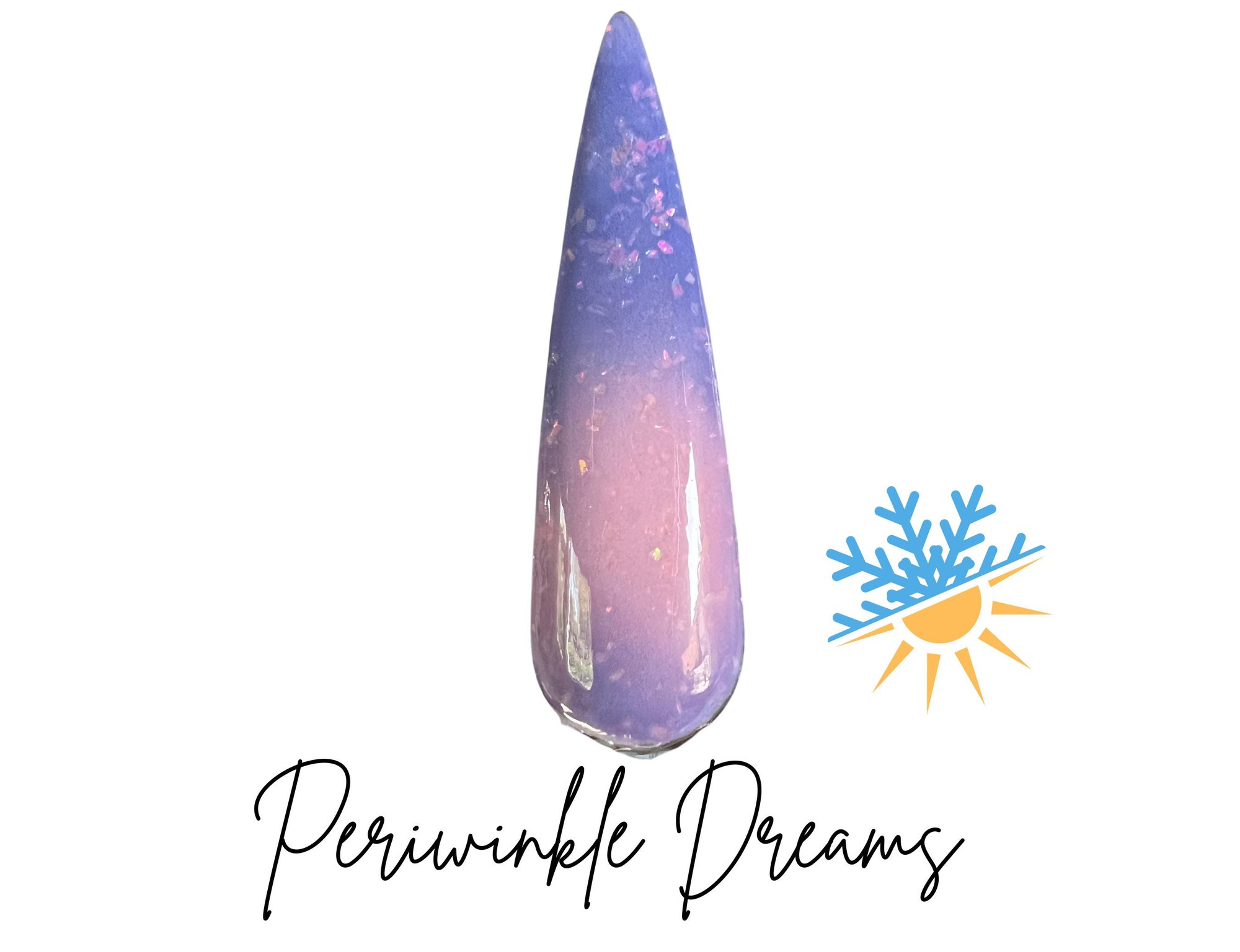 “Periwinkle Dreams” is a fun tthermal dip featuring ultra fine flakies. This thermal changes from a lilac purple when cold to pink when warm.