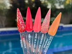 Our dip powders are sold in 1/4 oz, 1/2 oz or full size 1 oz jars and are available in a variety colors and glitters. All of our powders are MMA free, non-yellowing and made with high quality cosmetic grade ingredients. All swatches are dipped 3 times and then followed with a clear dip powder coat. All swatches use our Dipping System liquids. For best results, we recommend following the same process. Our Dip powder nails can last anywhere from 2-4 weeks!