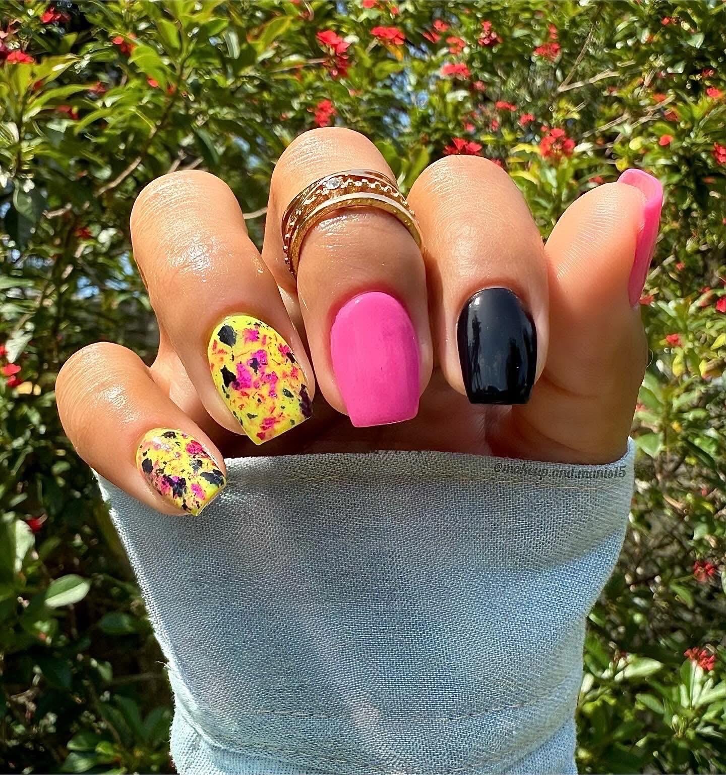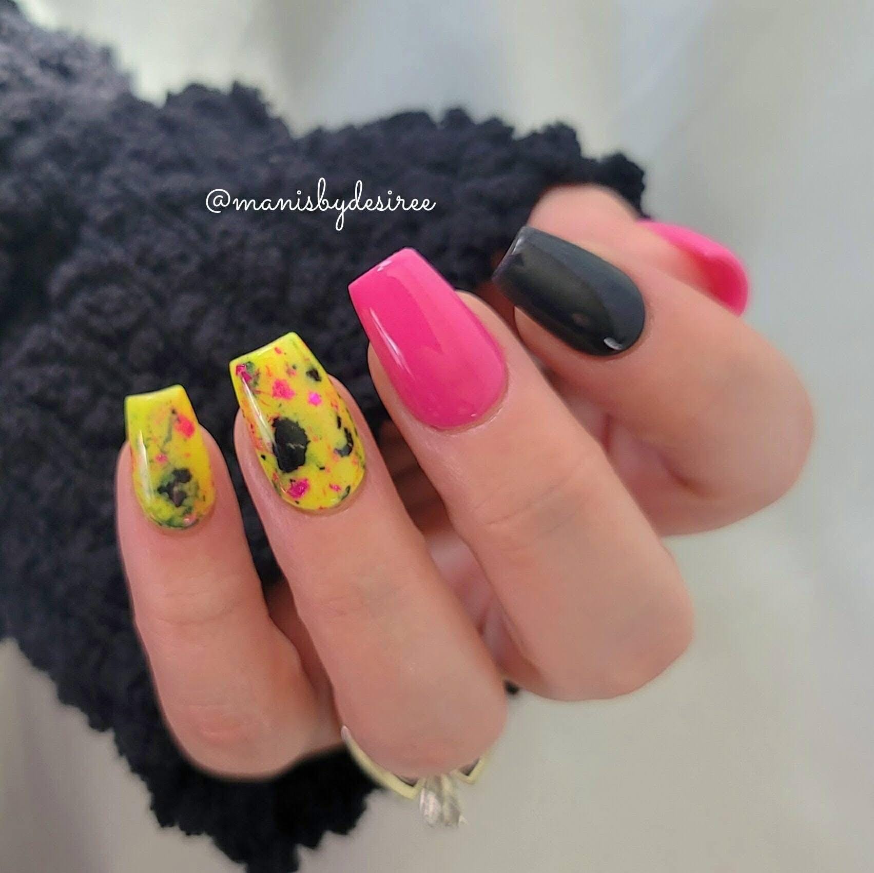 Your manis will be ready to rock with this fun powder! Punk Rock is a neon yellow dip powder featuring black and magenta foils!