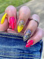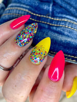 Our dip powders are sold in 1/4 oz, 1/2 oz or full size 1 oz jars and are available in a variety colors and glitters. All of our powders are MMA free, non-yellowing and made with high quality cosmetic grade ingredients. All swatches are dipped 3 times and then followed with a clear dip powder coat. All swatches use our Dipping System liquids. For best results, we recommend following the same process. Our Dip powder nails can last anywhere from 2-4 weeks!