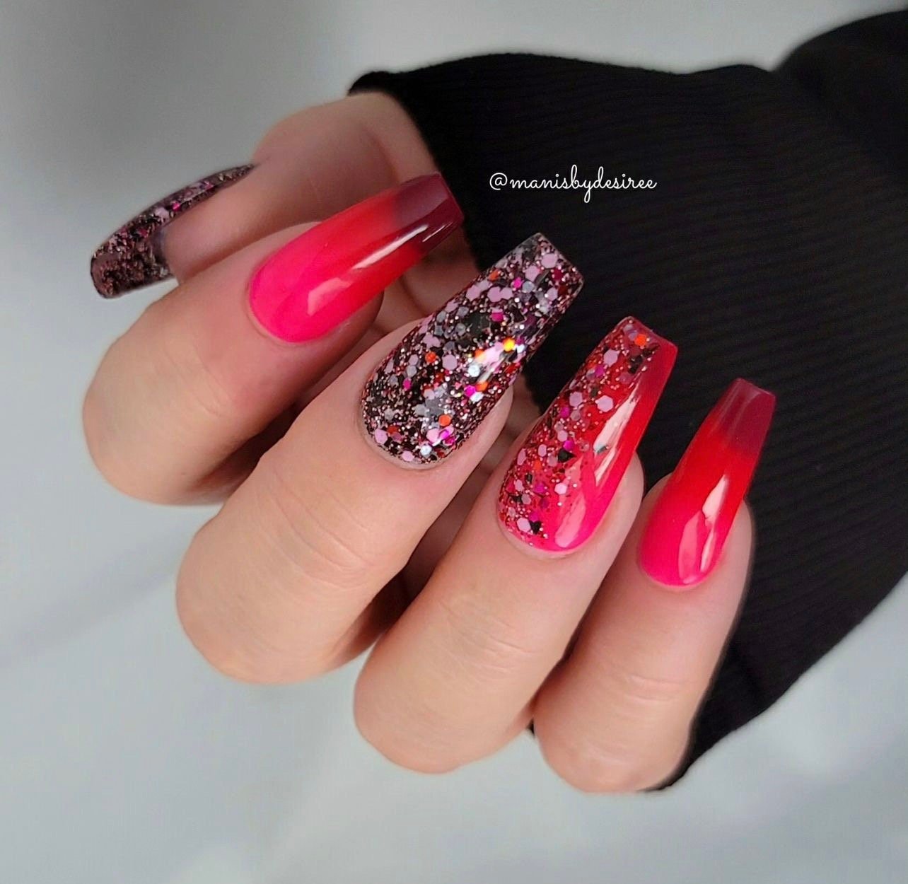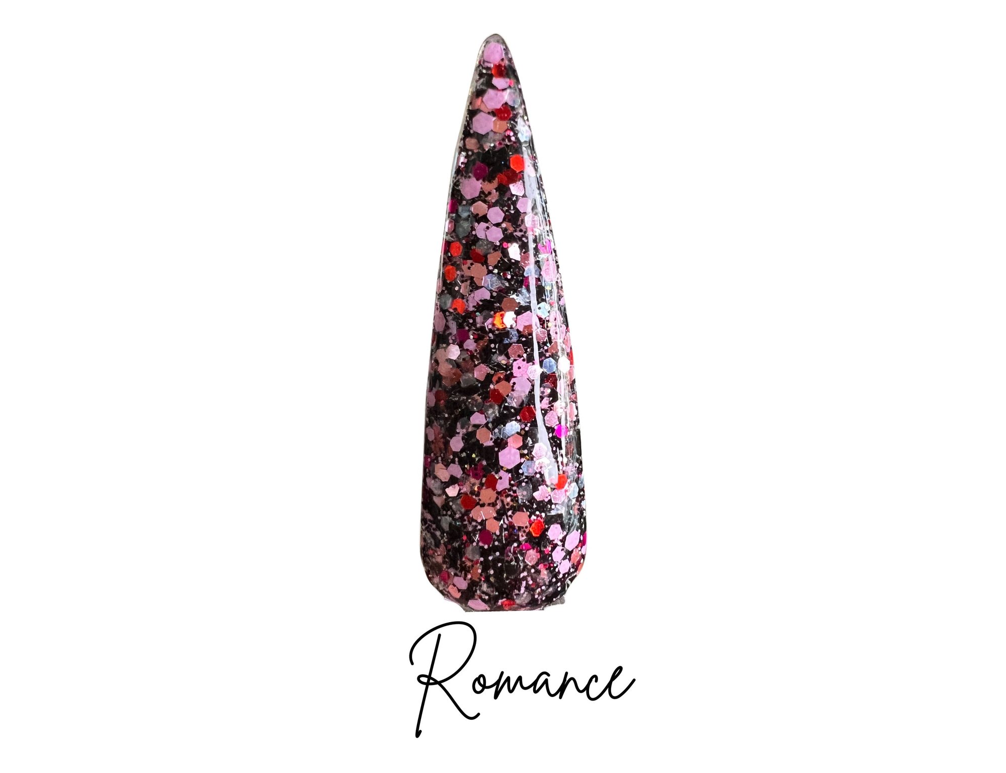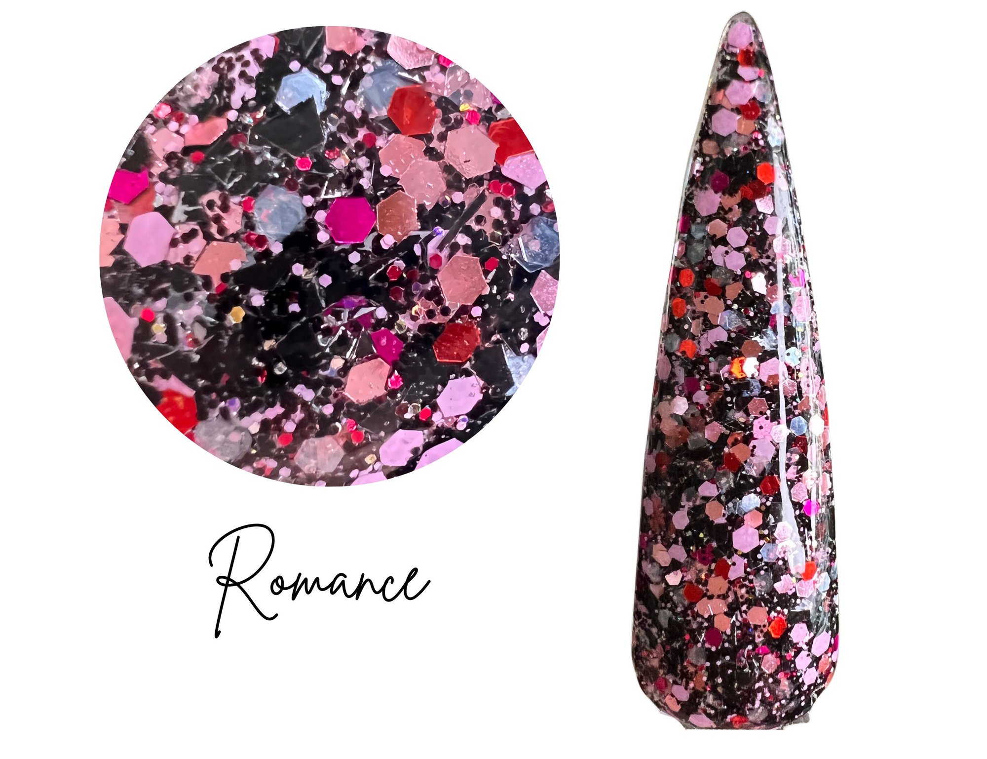 A small glitter mix perfect for Valentine’s Day manis! Featuring pink, black, red and magenta glitter.