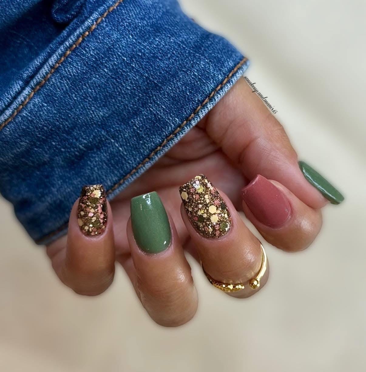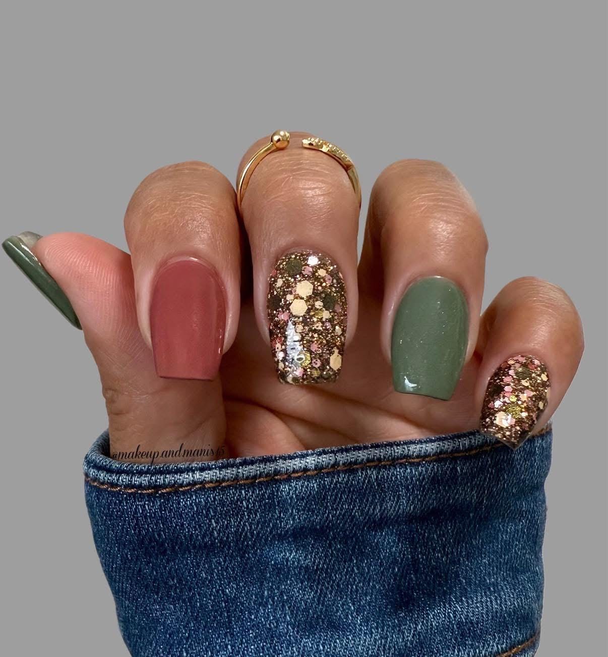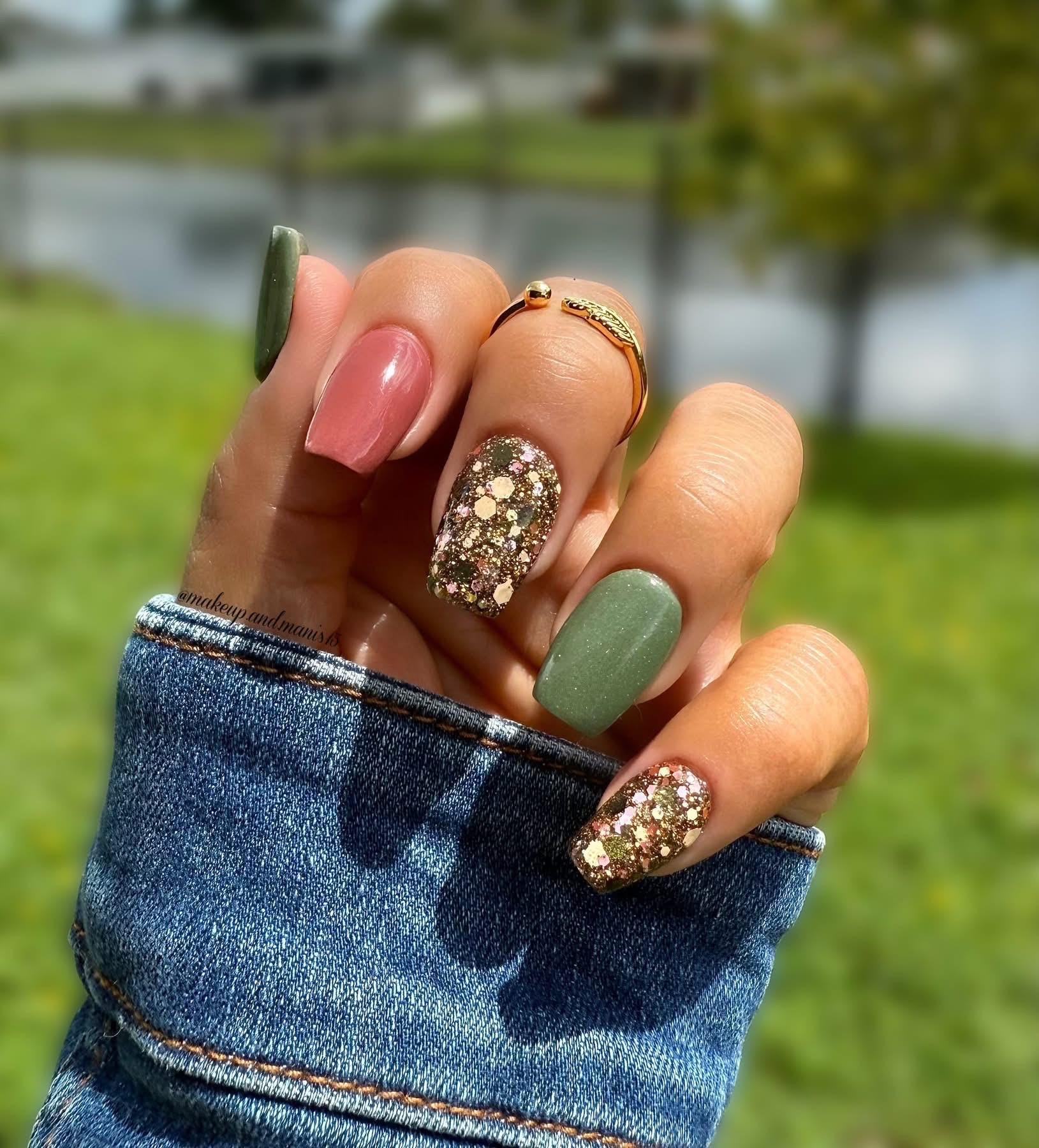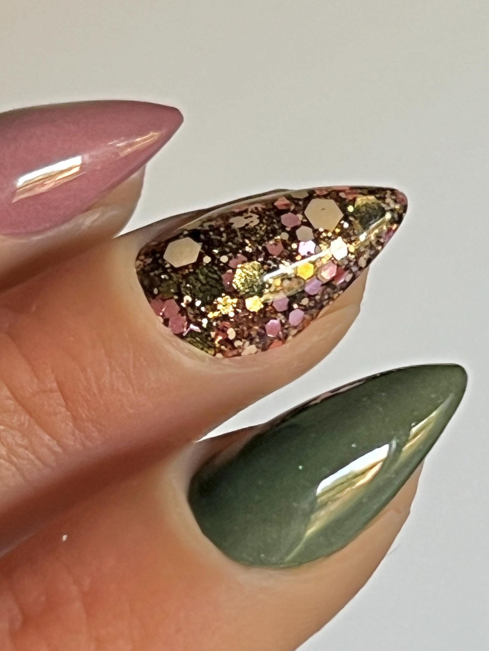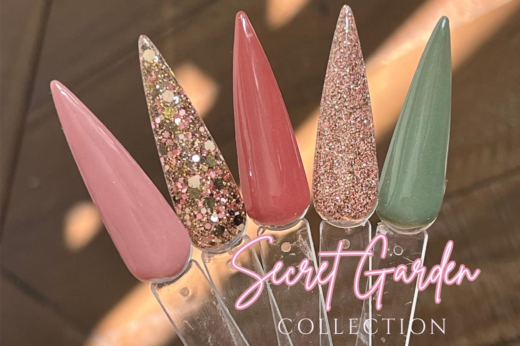 “Secret Garden” is an easy to use medium chunky glitter dip! Featuring olive, peach, pink and brown glitter.