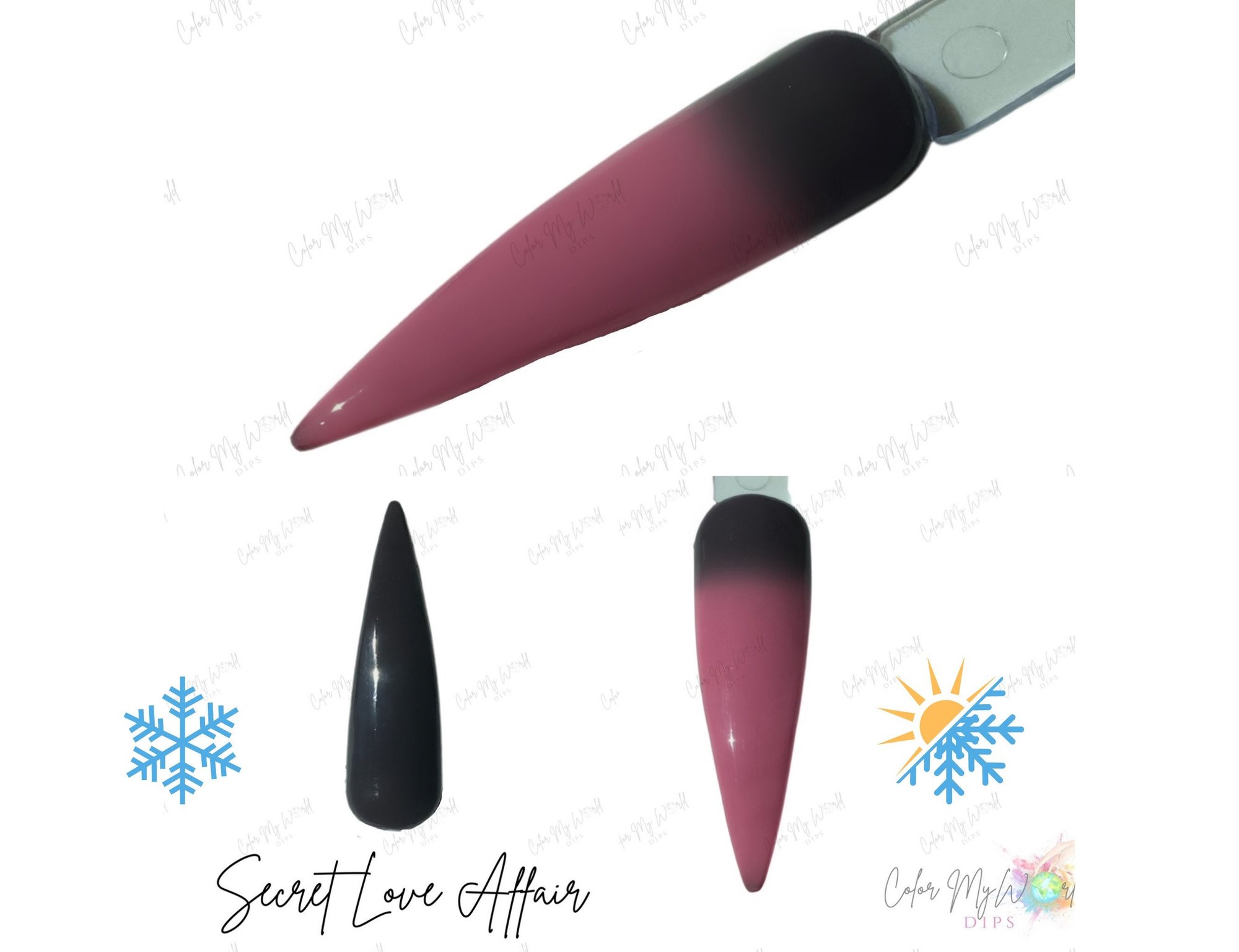 Part of our Thermal Dip Powder Collection! This color changing dip powder reacts to temperature changes. This beautiful thermal changes from black when it’s cold to a pink shade when it’s hot.