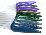 Our dip powders are sold in 1/4 oz, 1/2 oz or full size 1 oz jars and are available in a variety colors and glitters. All of our powders are MMA free, non-yellowing and made with high quality cosmetic grade ingredients. All swatches are dipped 3 times and then followed with a clear dip powder coat. All swatches use our Dipping System liquids. For best results, we recommend following the same process. Our Dip powder nails can last anywhere from 2-4 weeks!