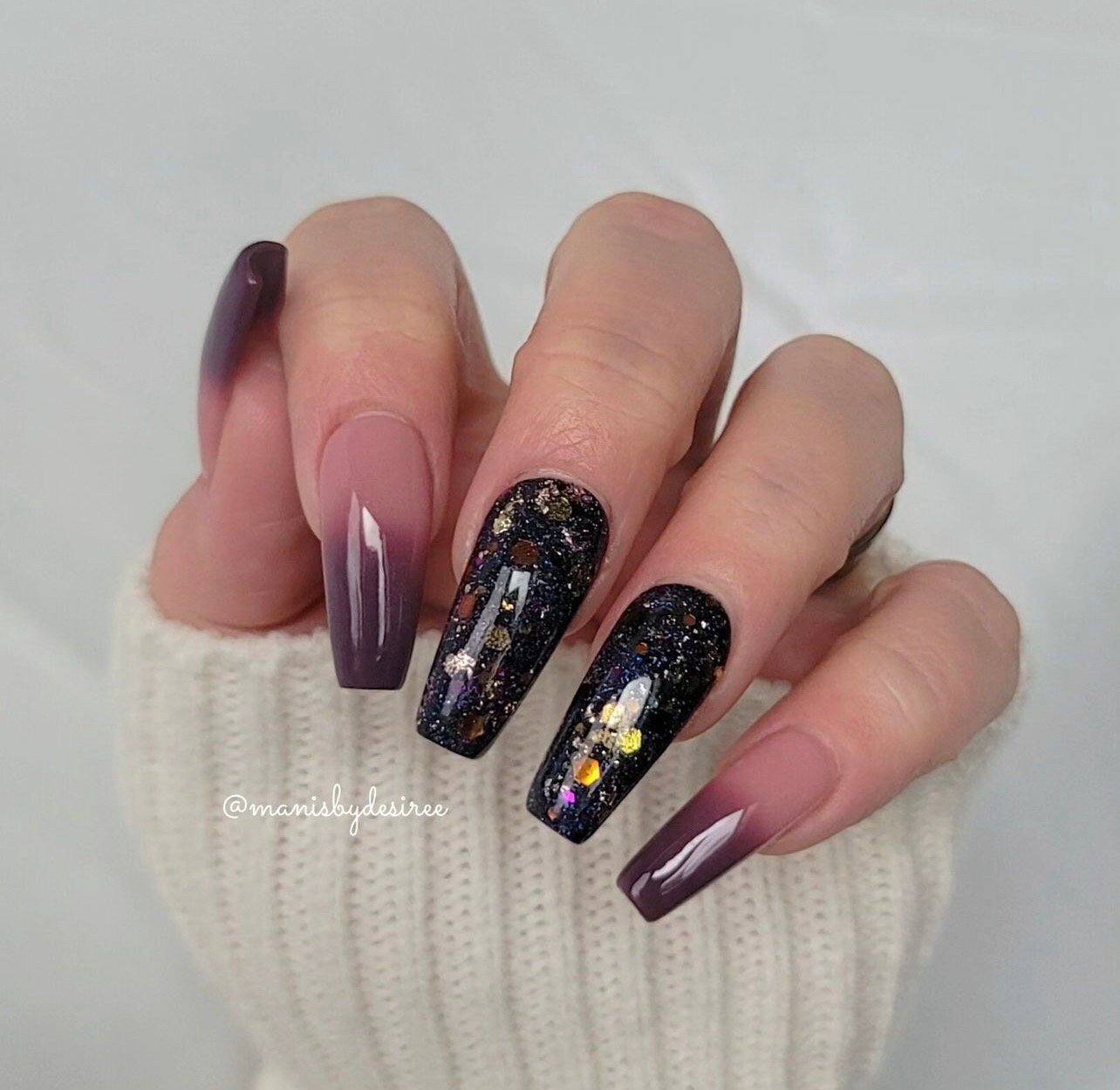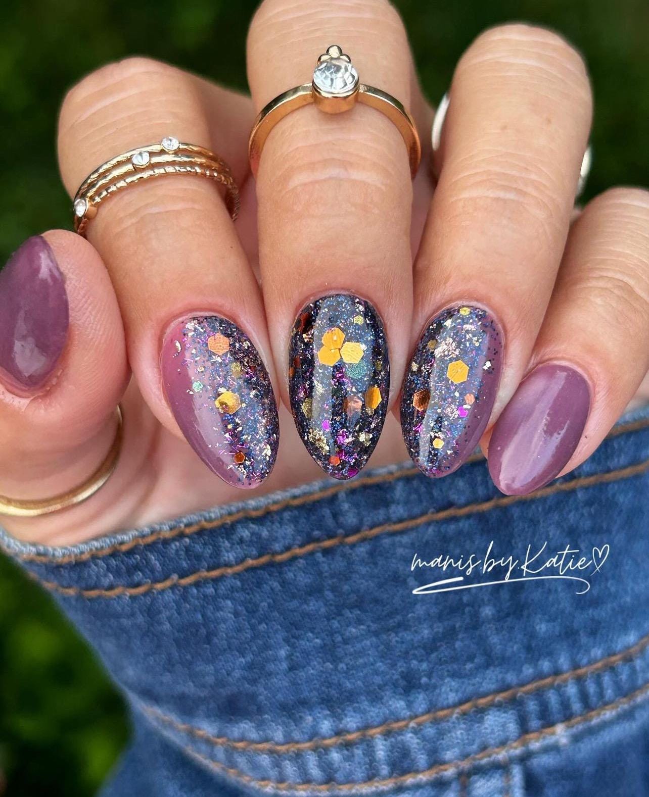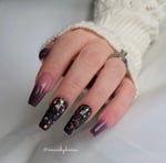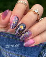 This foil dip powder features a solid dusty purple base with brown and purple foils.
