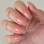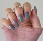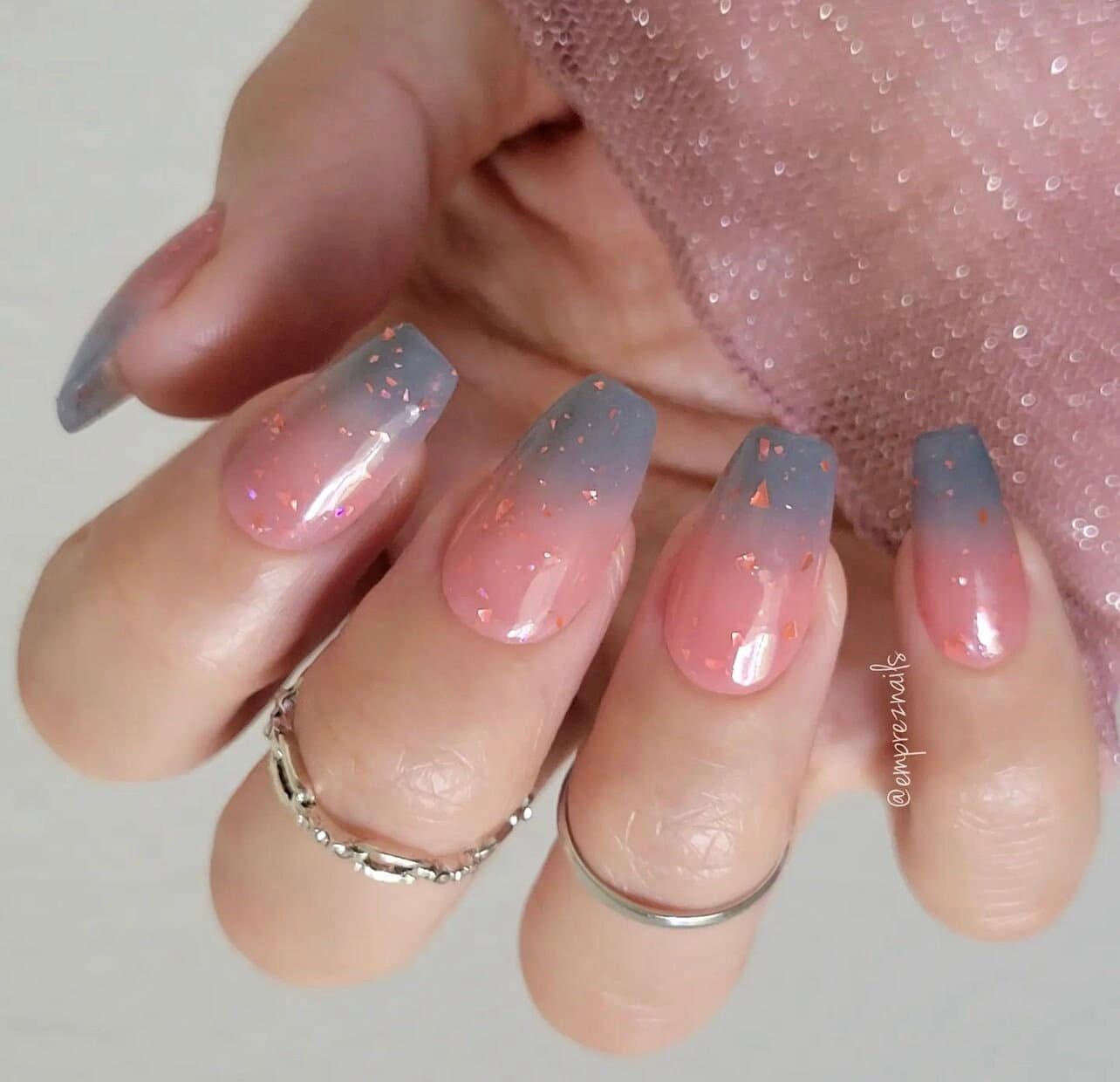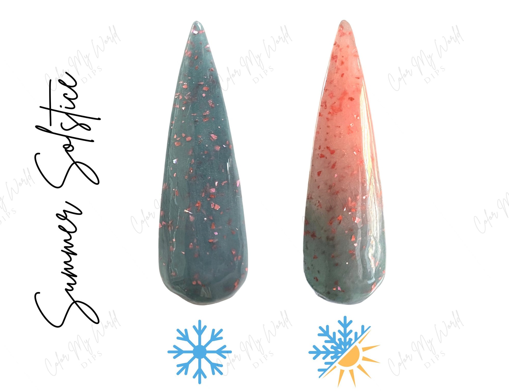 Summer Soltice is a thermal changing dip featuring fine coral holographic shard glitter. It changes from a Smoky teal when cold to a pink coral when warm.