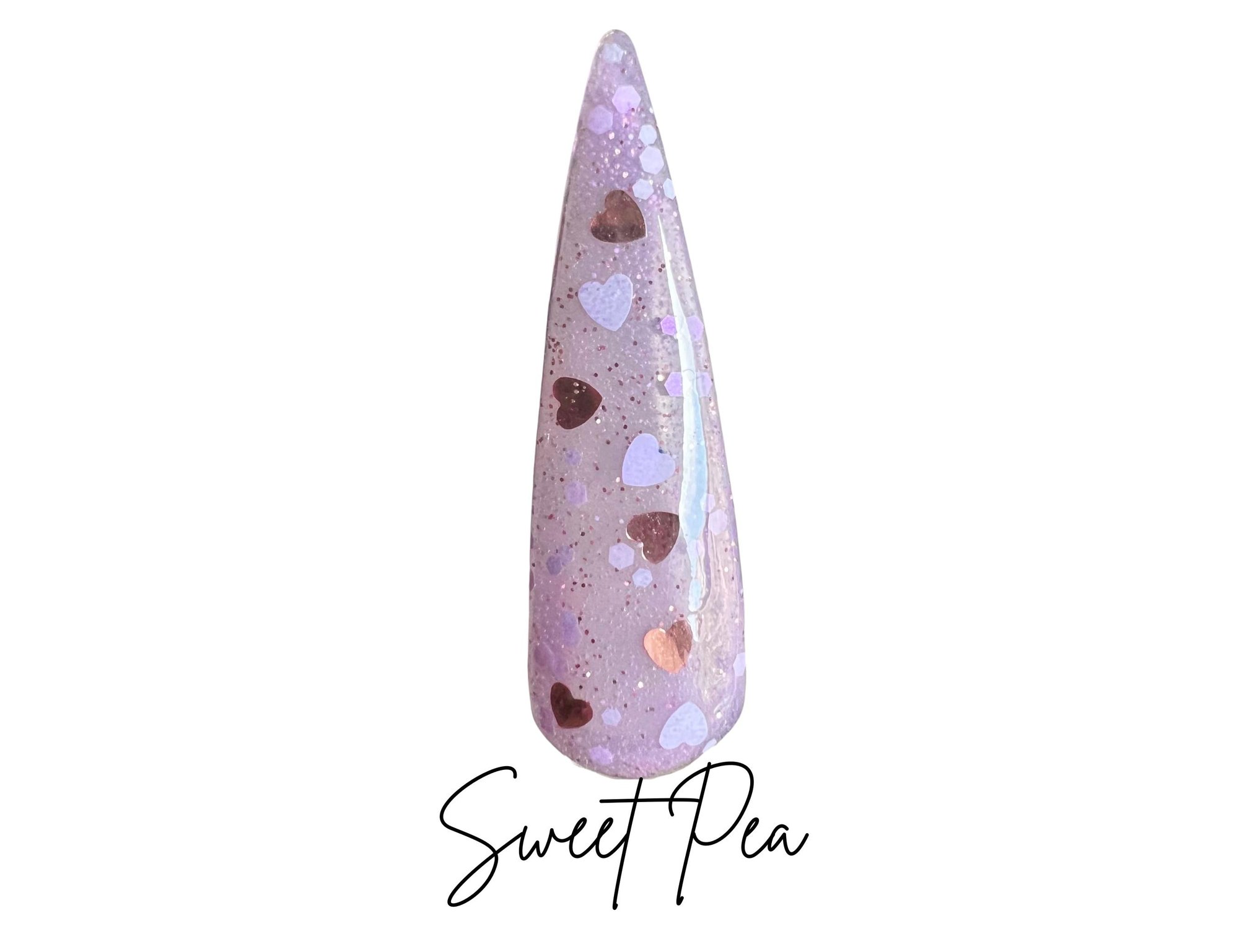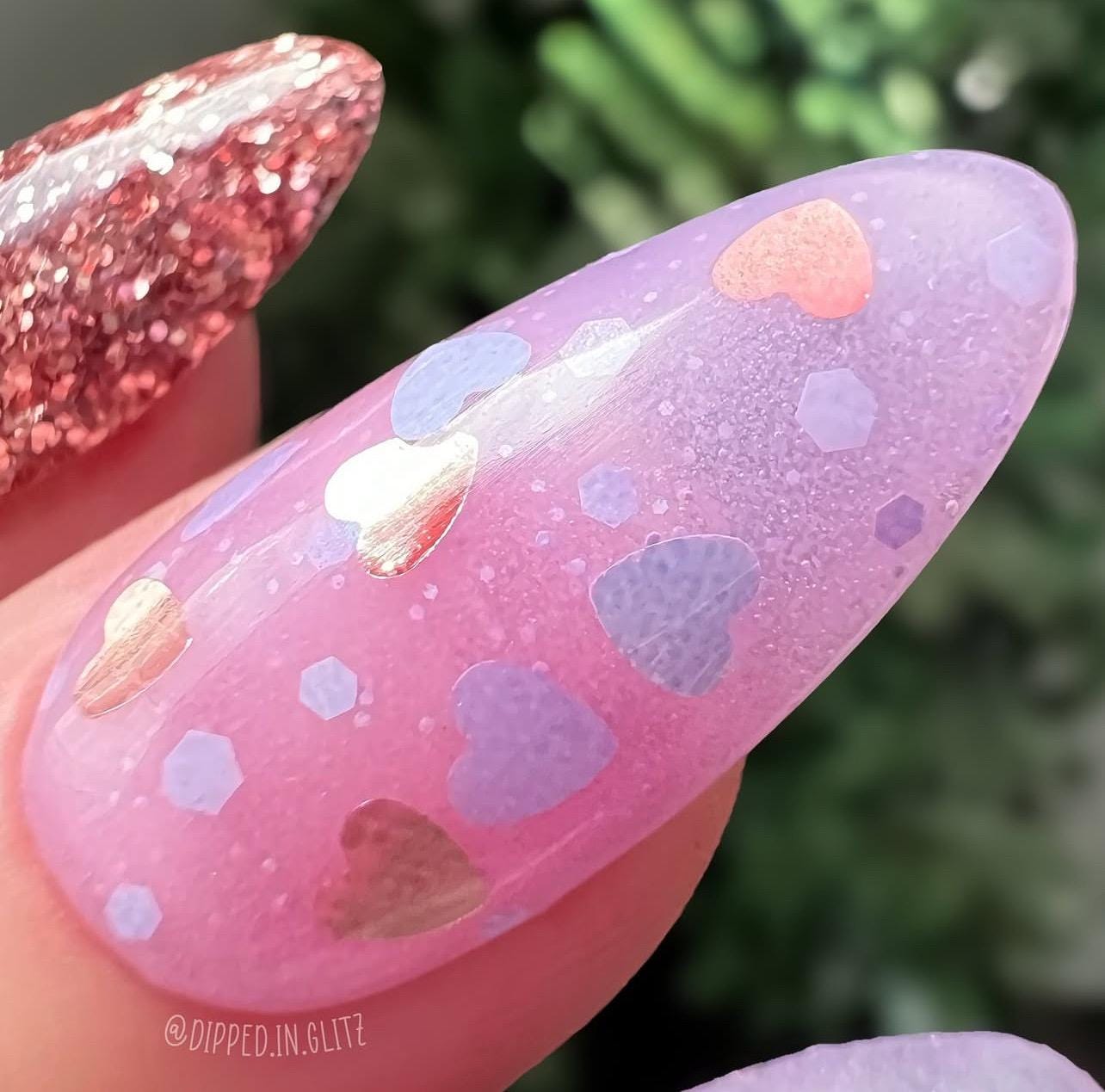 A sheer lilac purple powder with rose gold and lilac heart glitters!