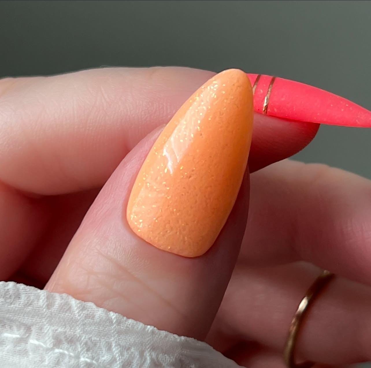 Tangerine Bliss is a orange dip powder featuring fine golden flakies for the perfect sparkle!