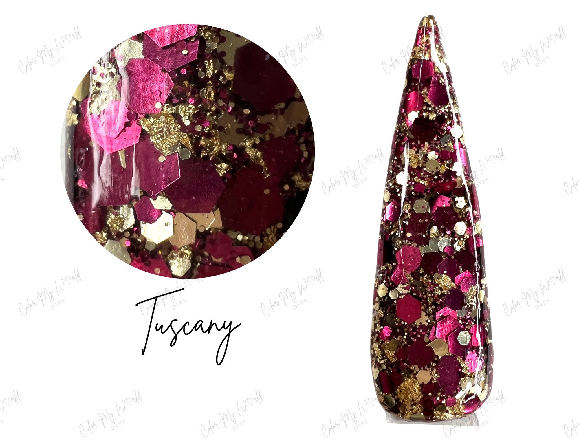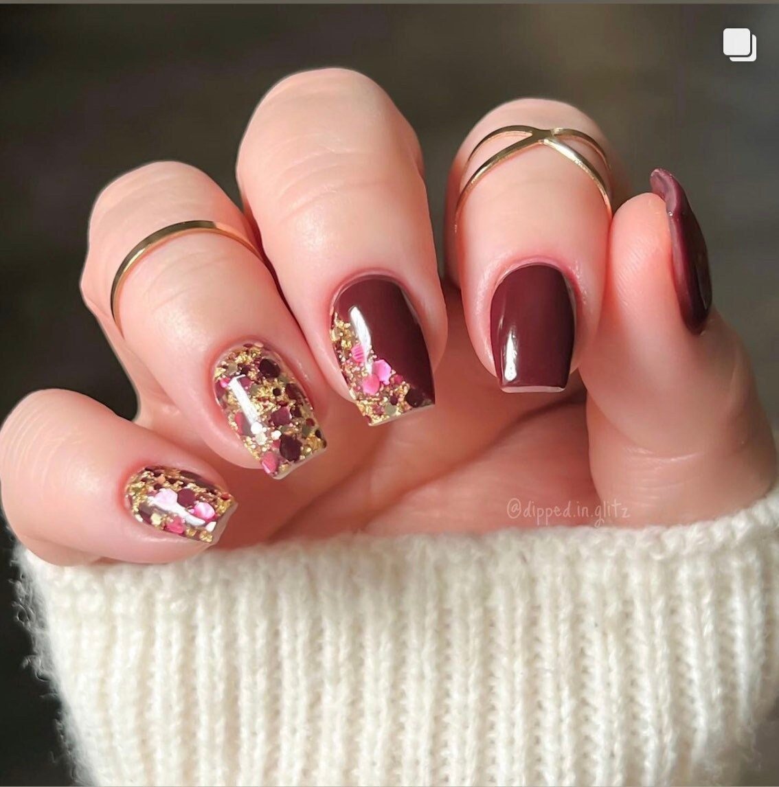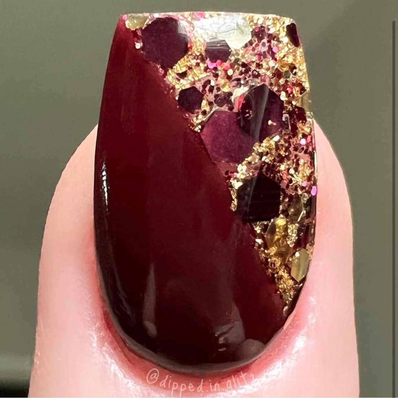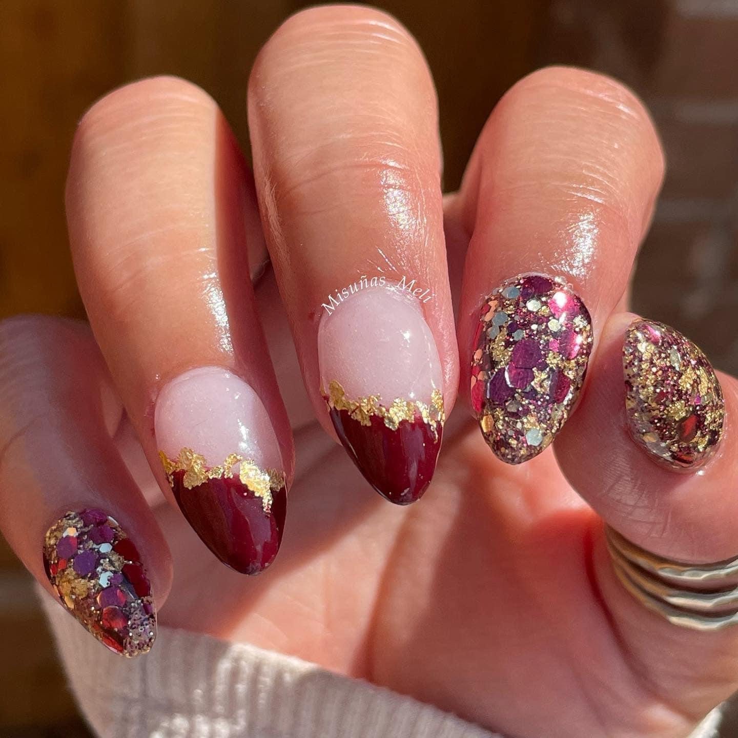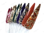 Part of our Fall Destinations collection. This stunning fall dip powder features burgundy, and gold glitters with gold foils.