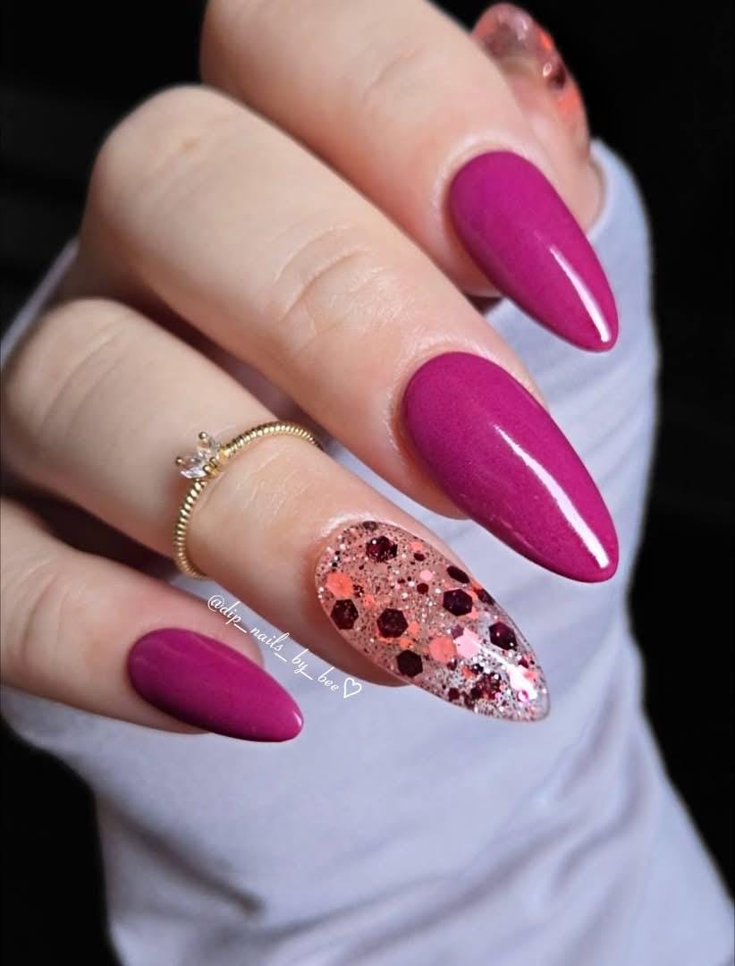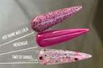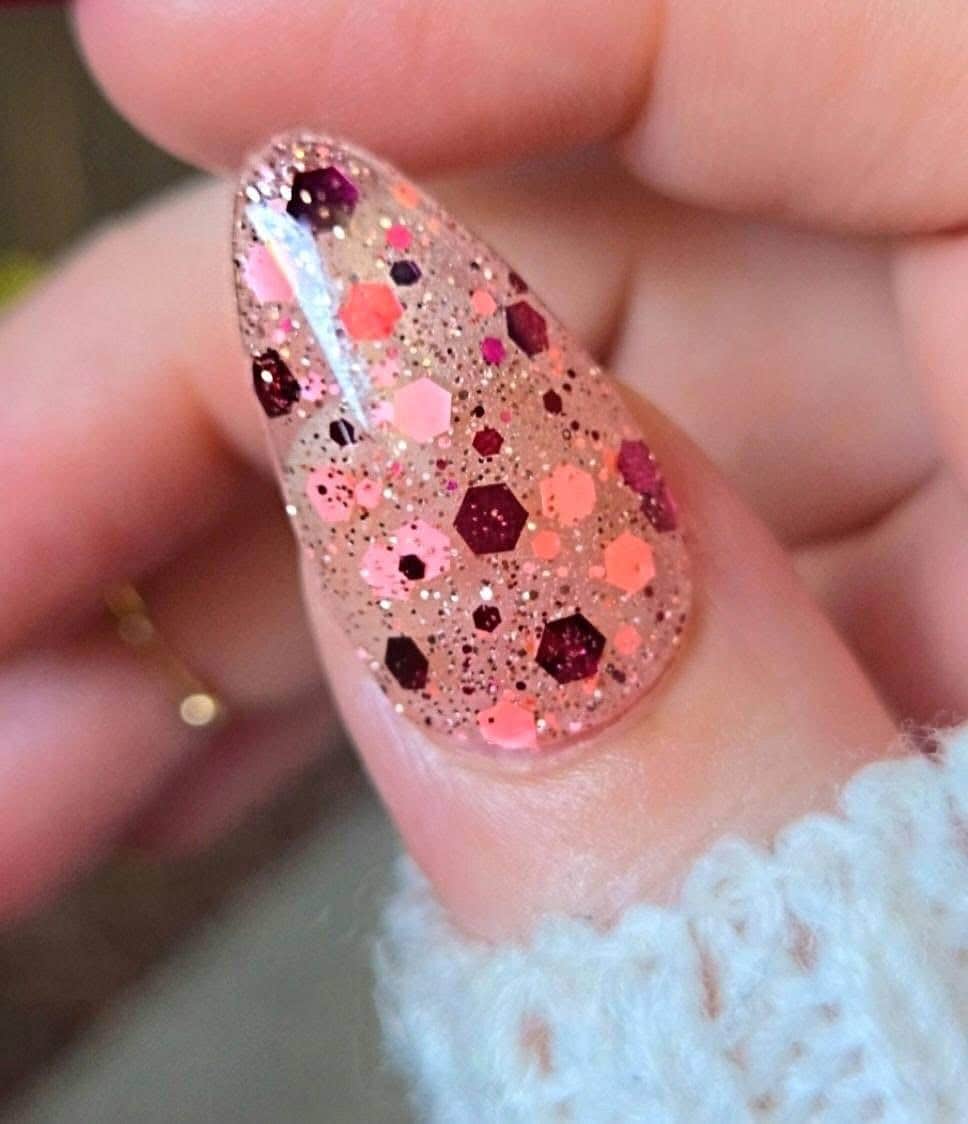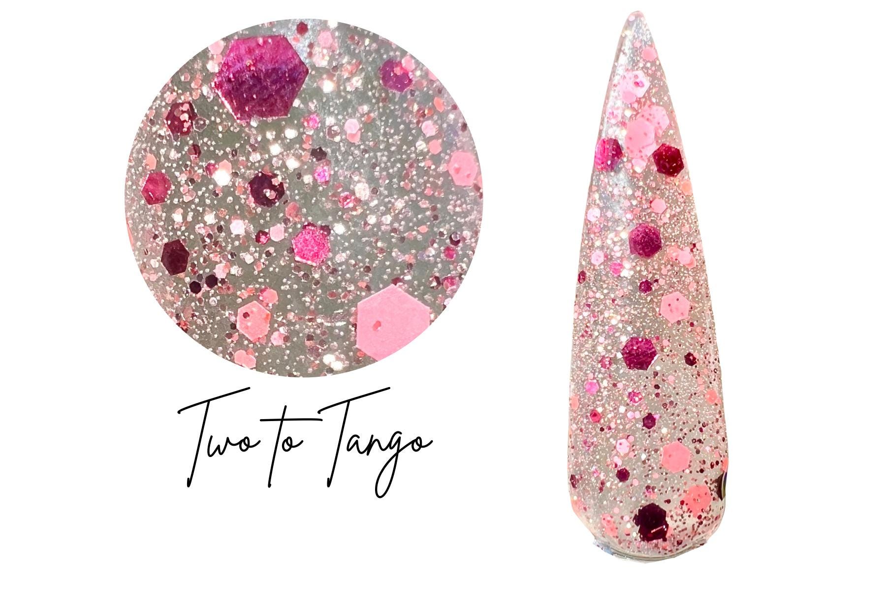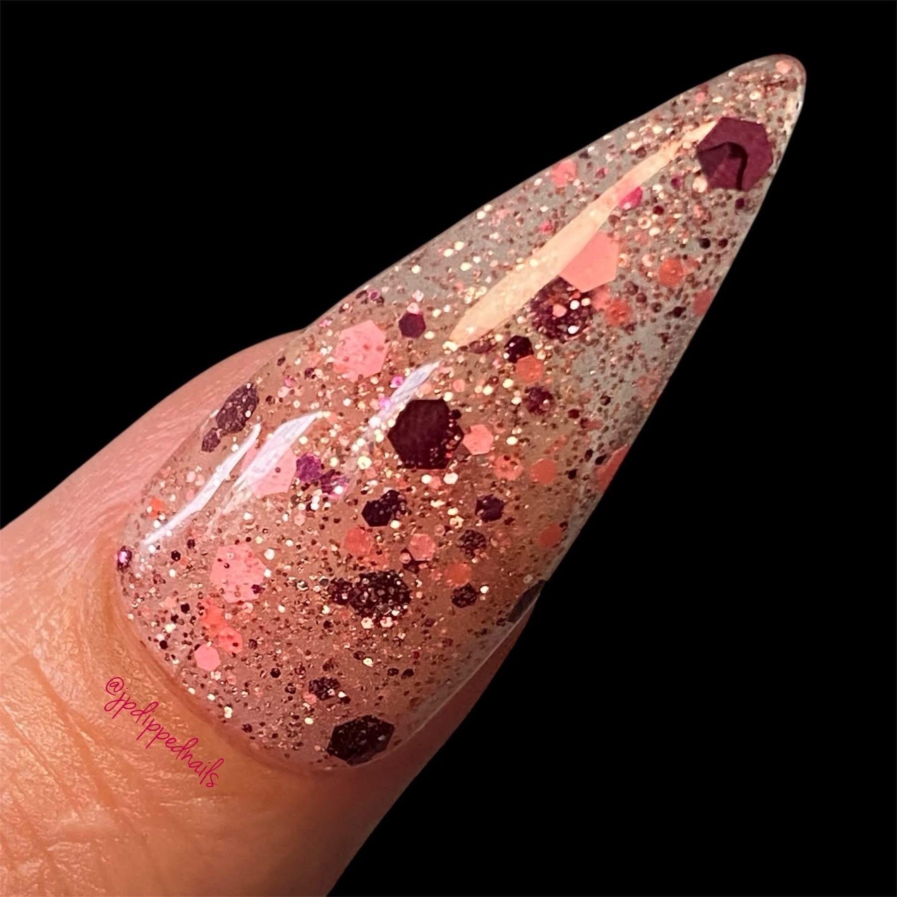 “Two to Tango” is a fun burgundy and coral glitter dip set in a clear base! can be used as a topper over your favorite solid or wear it as is!