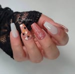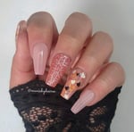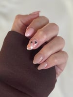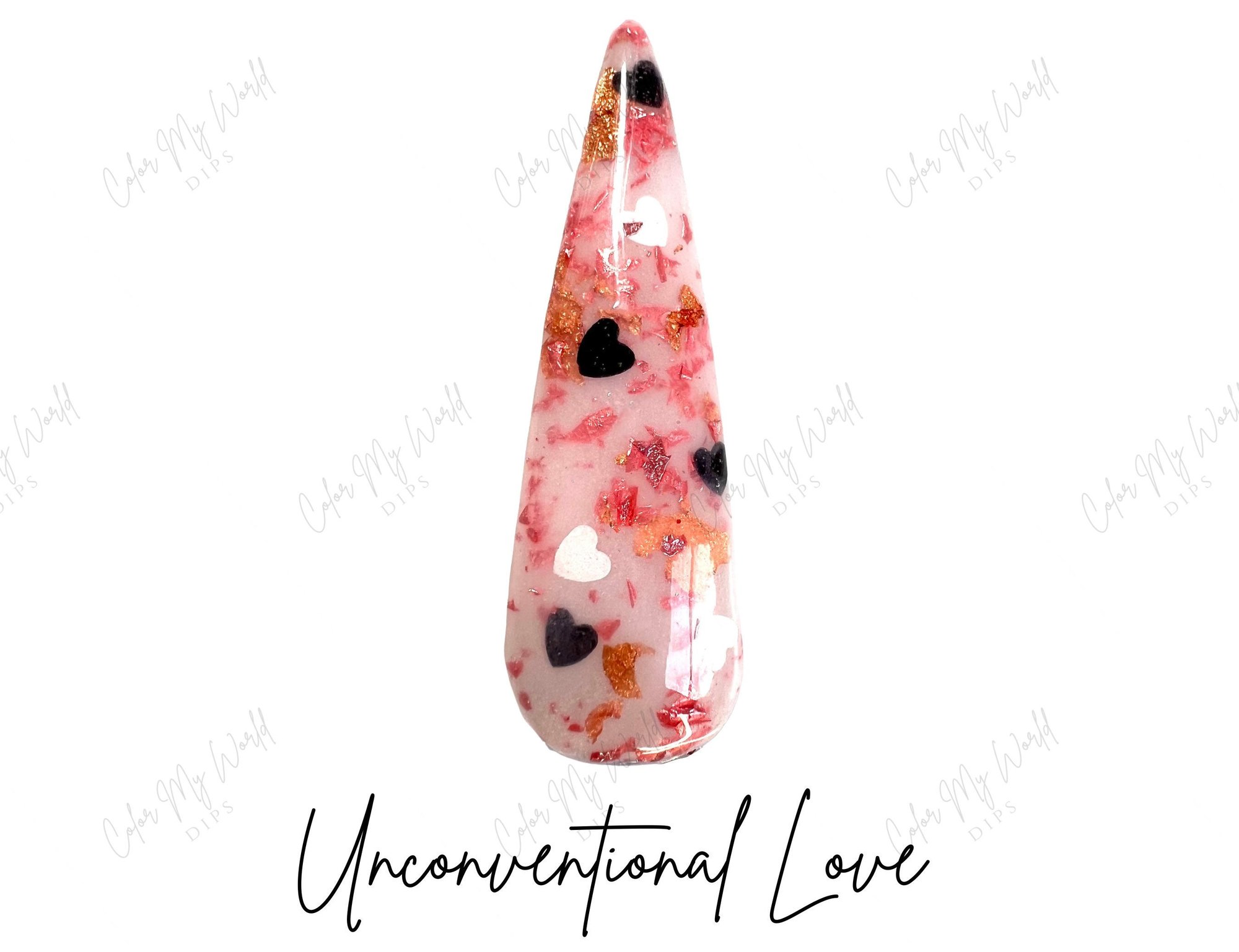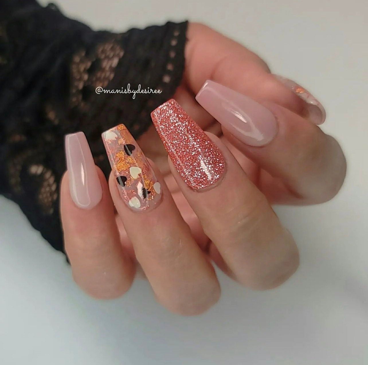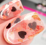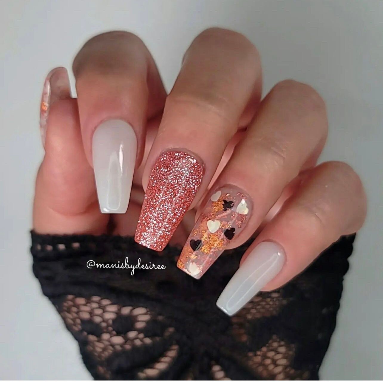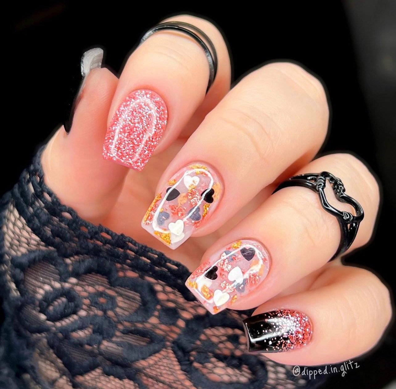 A milky base with rose gold/pink foils and white and black heart shapes!