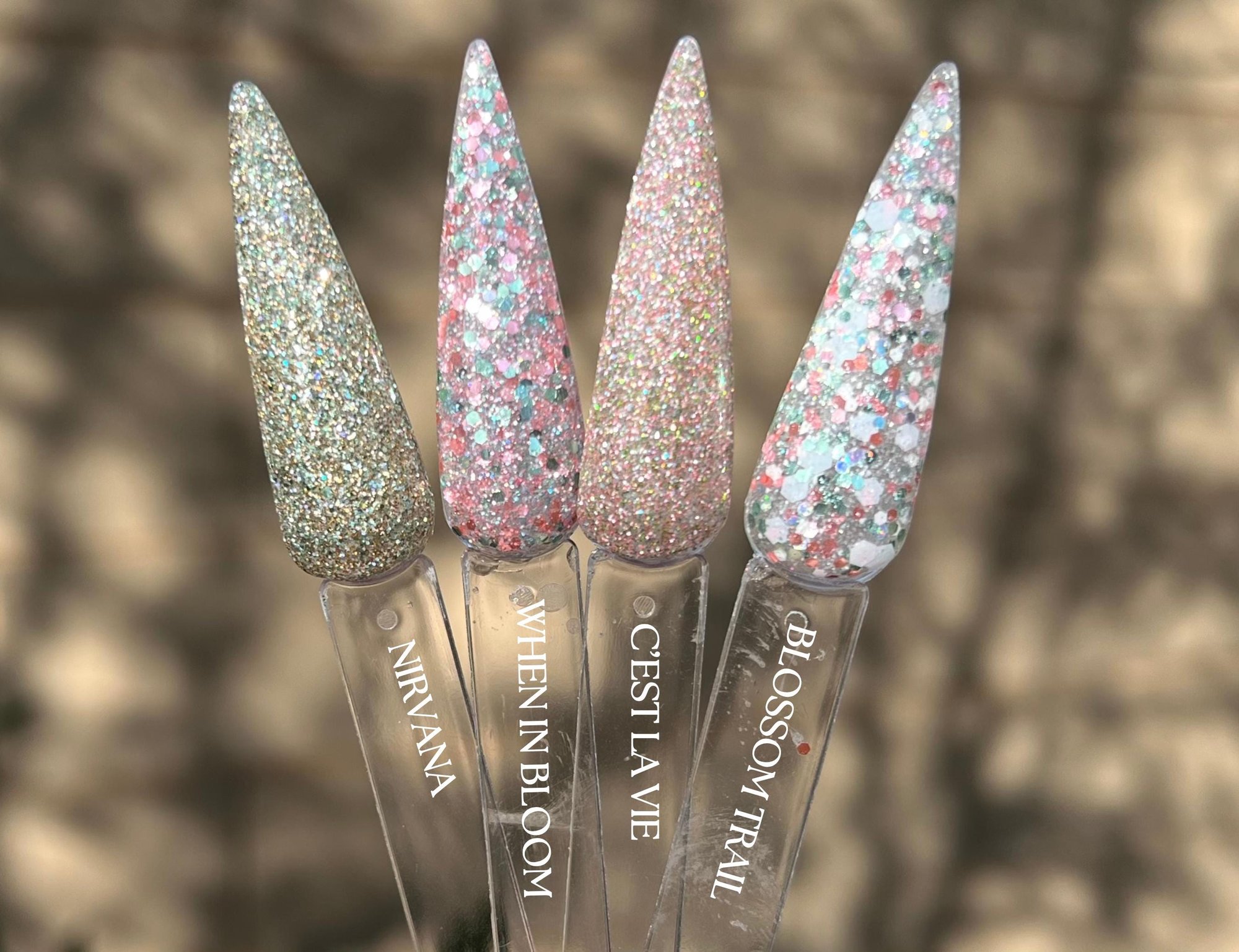 Our dip powders are sold in 1/4 oz, 1/2 oz or full size 1 oz jars and are available in a variety colors and glitters. All of our powders are MMA free, non-yellowing and made with high quality cosmetic grade ingredients. All swatches are dipped 3 times and then followed with a clear dip powder coat. All swatches use our Dipping System liquids. For best results, we recommend following the same process. Our Dip powder nails can last anywhere from 2-4 weeks!