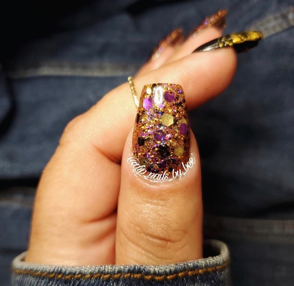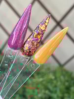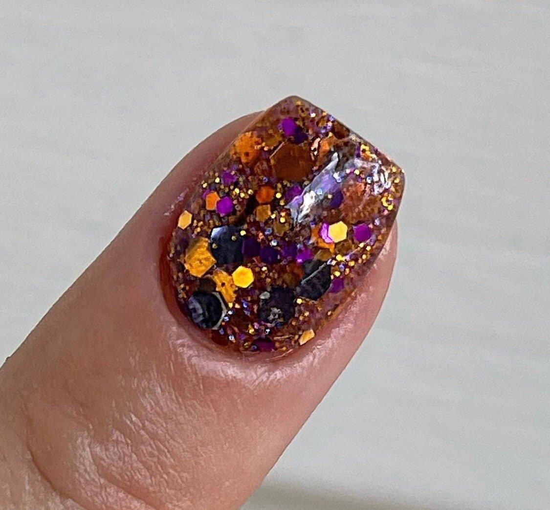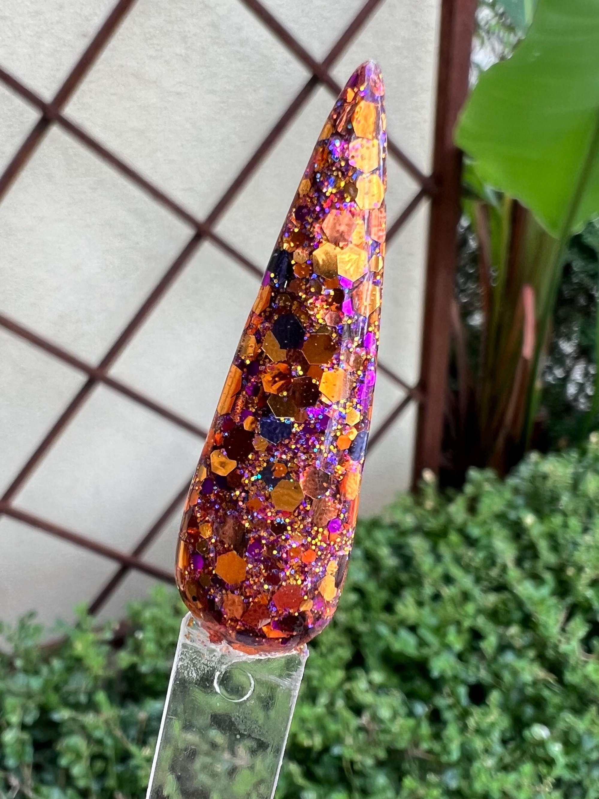 A gorgeous chunky glitter dip featuring orange, purple and black glitters.
