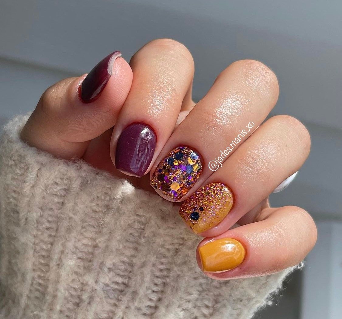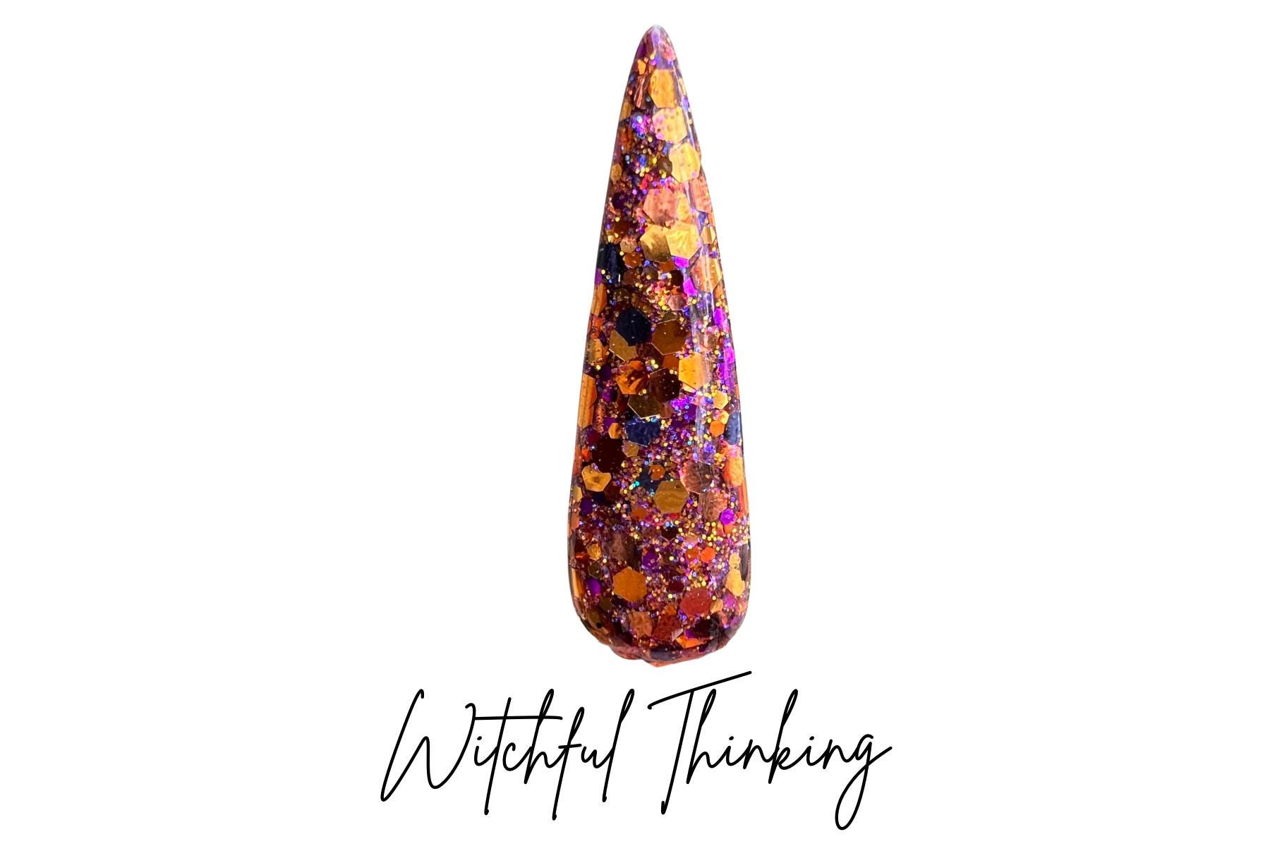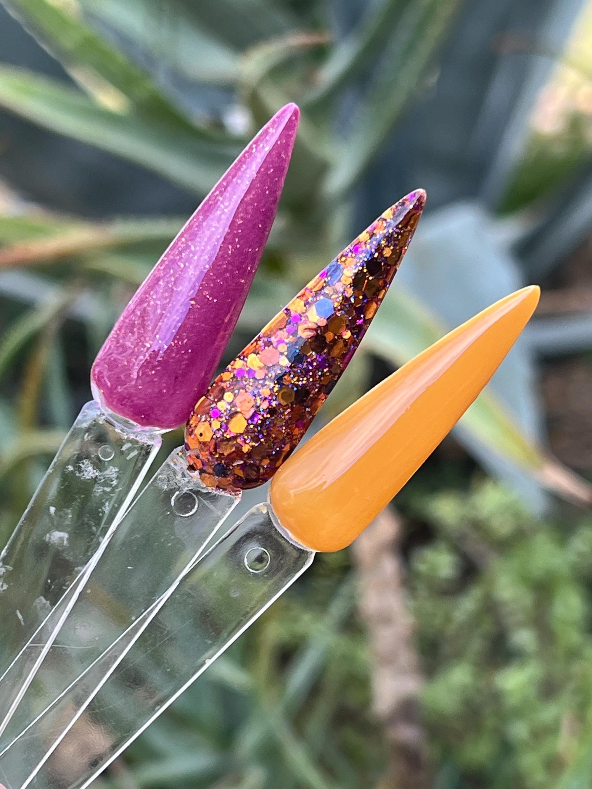 A gorgeous chunky glitter dip featuring orange, purple and black glitters.