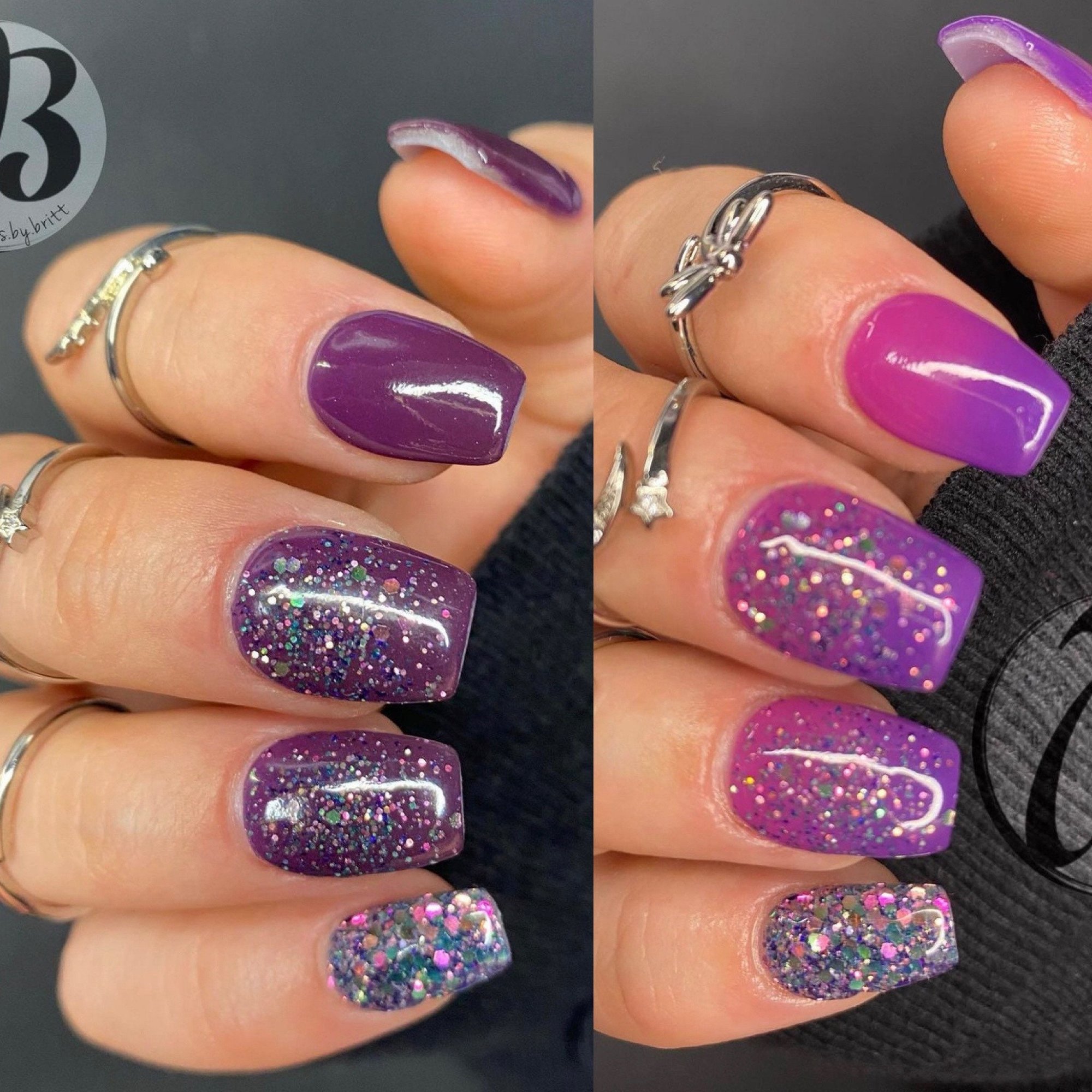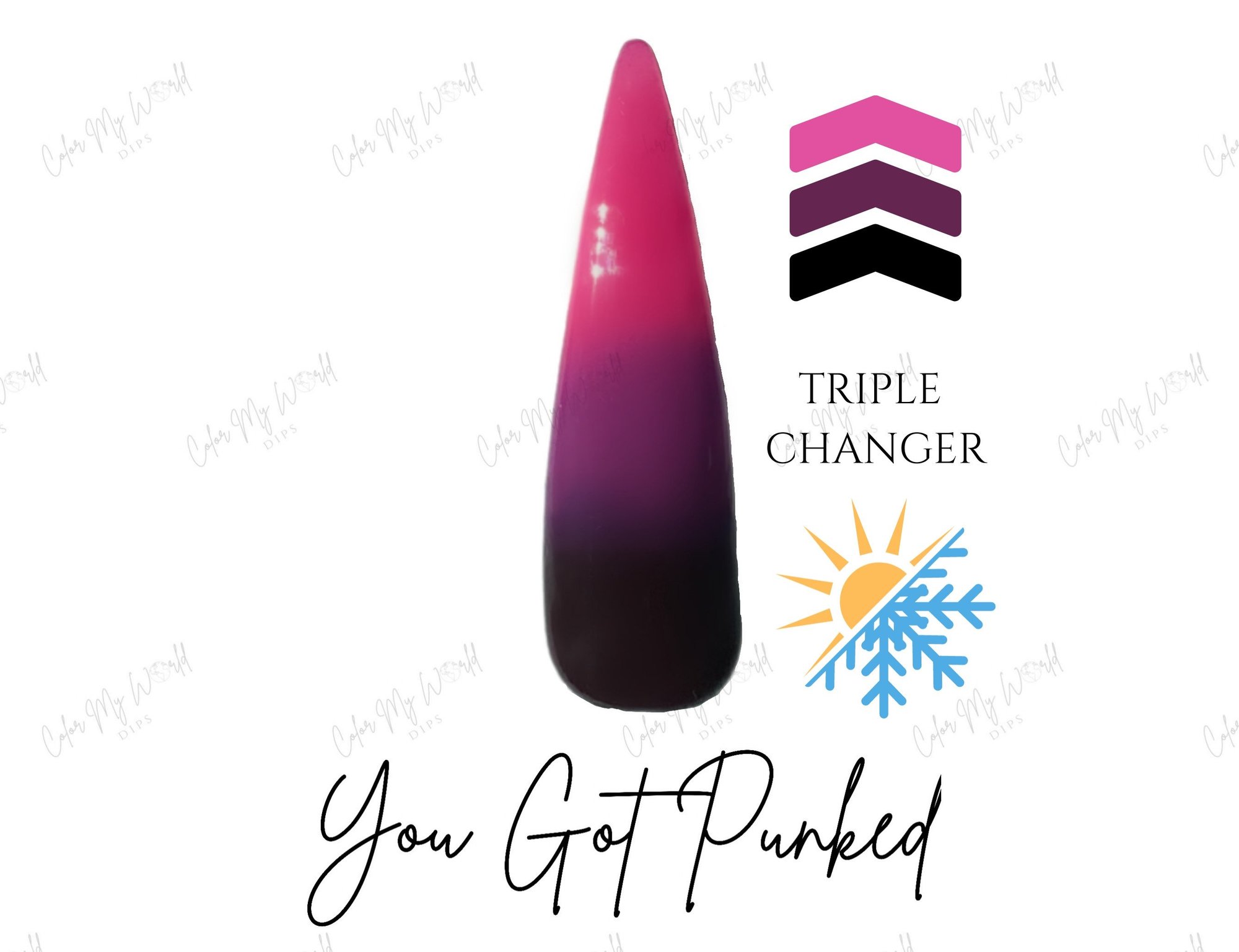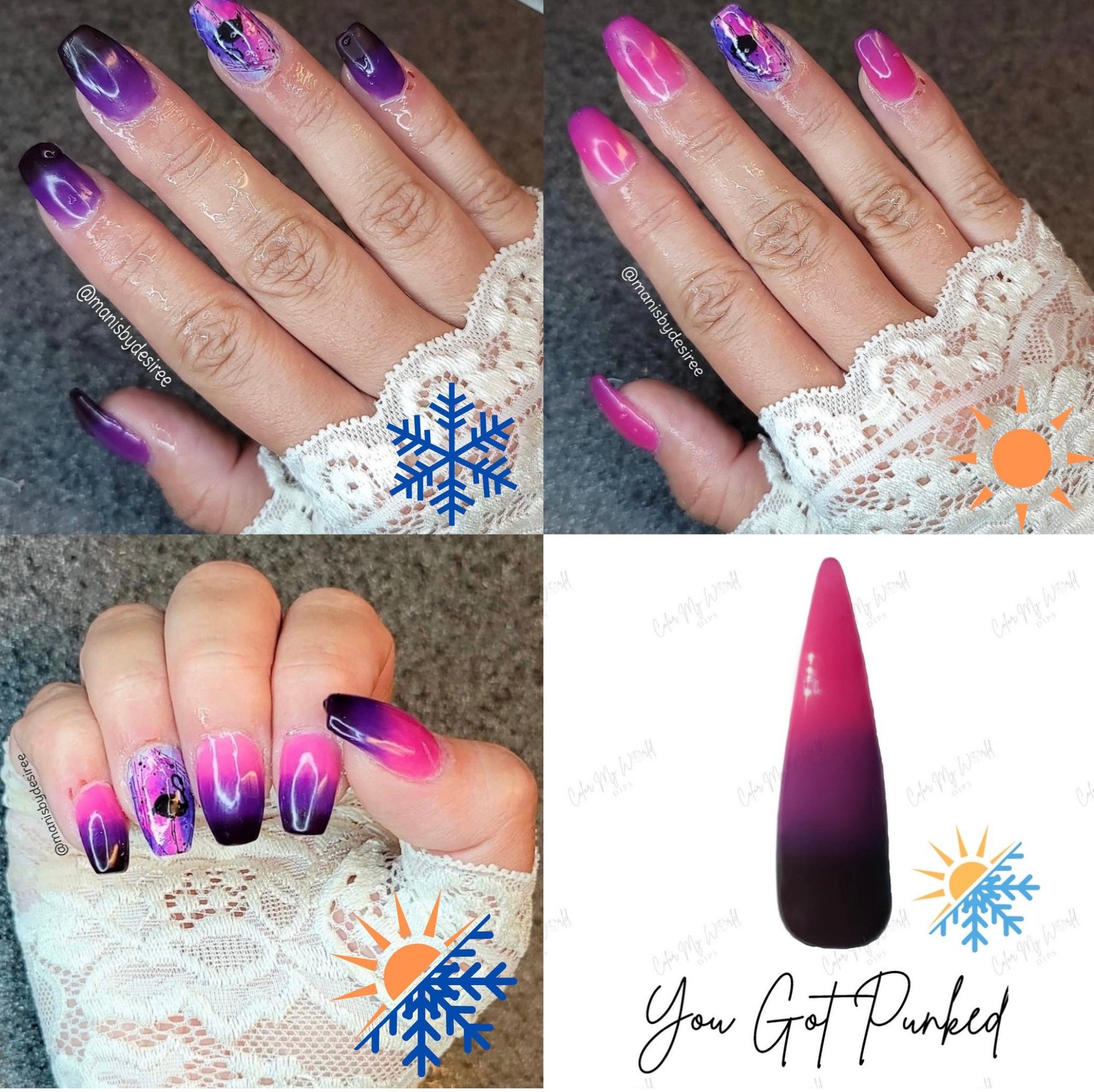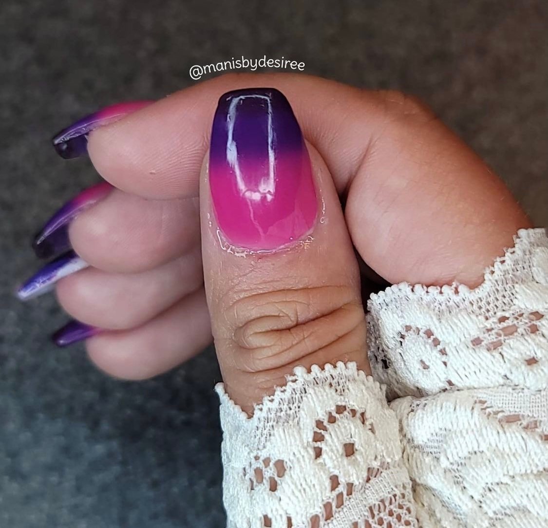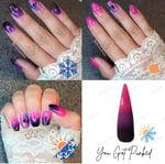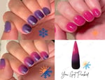 Part of our Thermal Dip Powder line, this color changing dip powder reacts to changes in temperature! This thermal changes to 3 different colors depending on temp. When it’s cold, it’s a black color and transitions from purple to pink as it gets hotter.